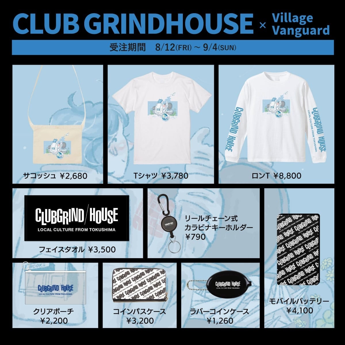 2022年8月12日(金)より、徳島県のライブハウス【GRINDHOUSE】とヴィレヴァンの限定コラボグッズがオンラインストアにて受注販売決定!受注開始と同時に徳島県内のヴィレッジヴァンガード一部店舗にて店頭販売も開始いたします!!今回コラボのためにイラストをご用意していただきました♪ライブでも活躍しそうなアイテムを厳選!激レアなコラボグッズをお見逃しなく!