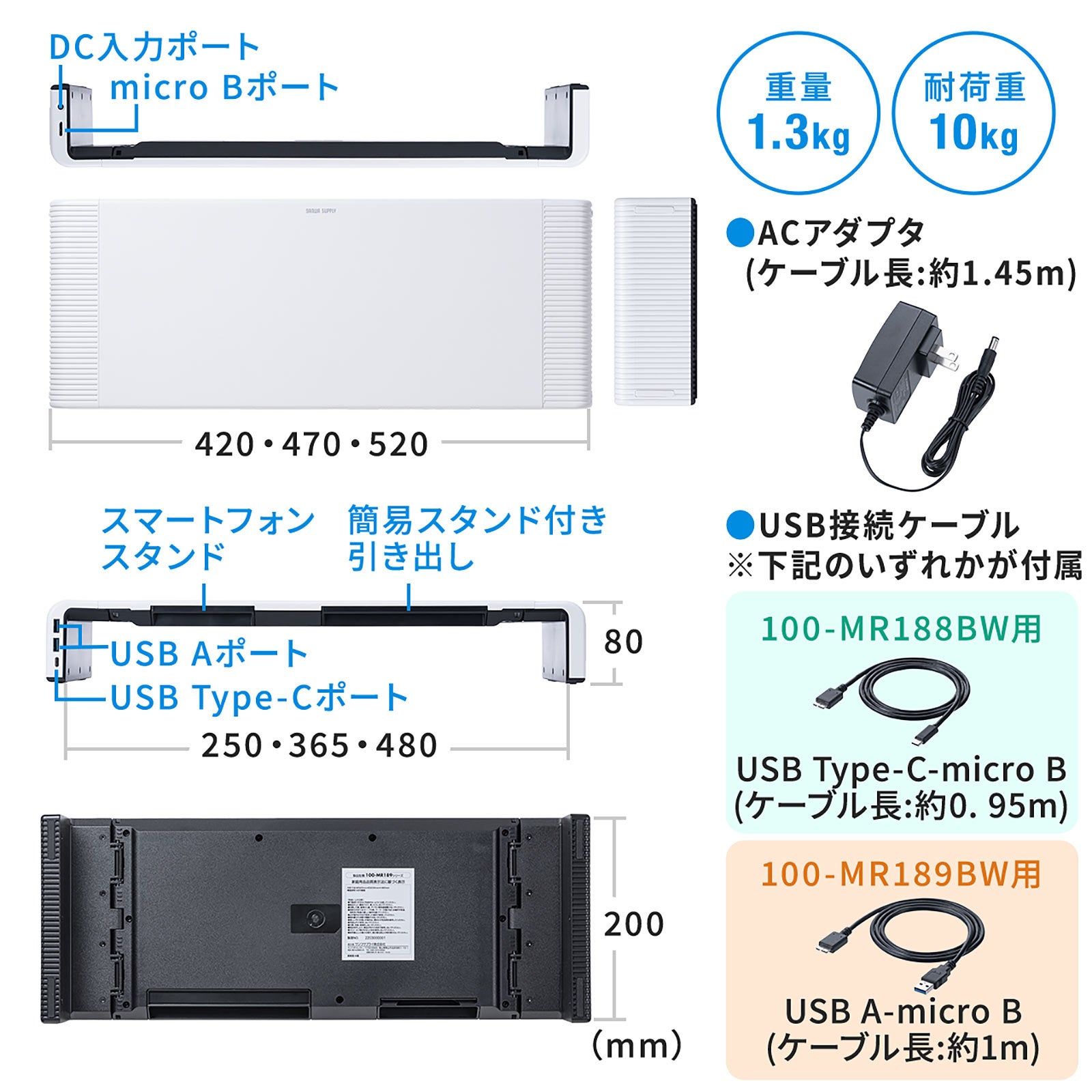 サンワサプライ株式会社(本社:岡山市北区田町1-10-1、 代表取締役社長 山田 和範)が運営している直販サイト『サンワダイレクト』では、ディスプレイ・モニターを設置でき、引き出し、スマホ/タブレットスタンド、USBハブ付きの多機能机上台 Type-C接続の「100-MR188BW」とType-A接続の「100-MR189BW」を発売しました。