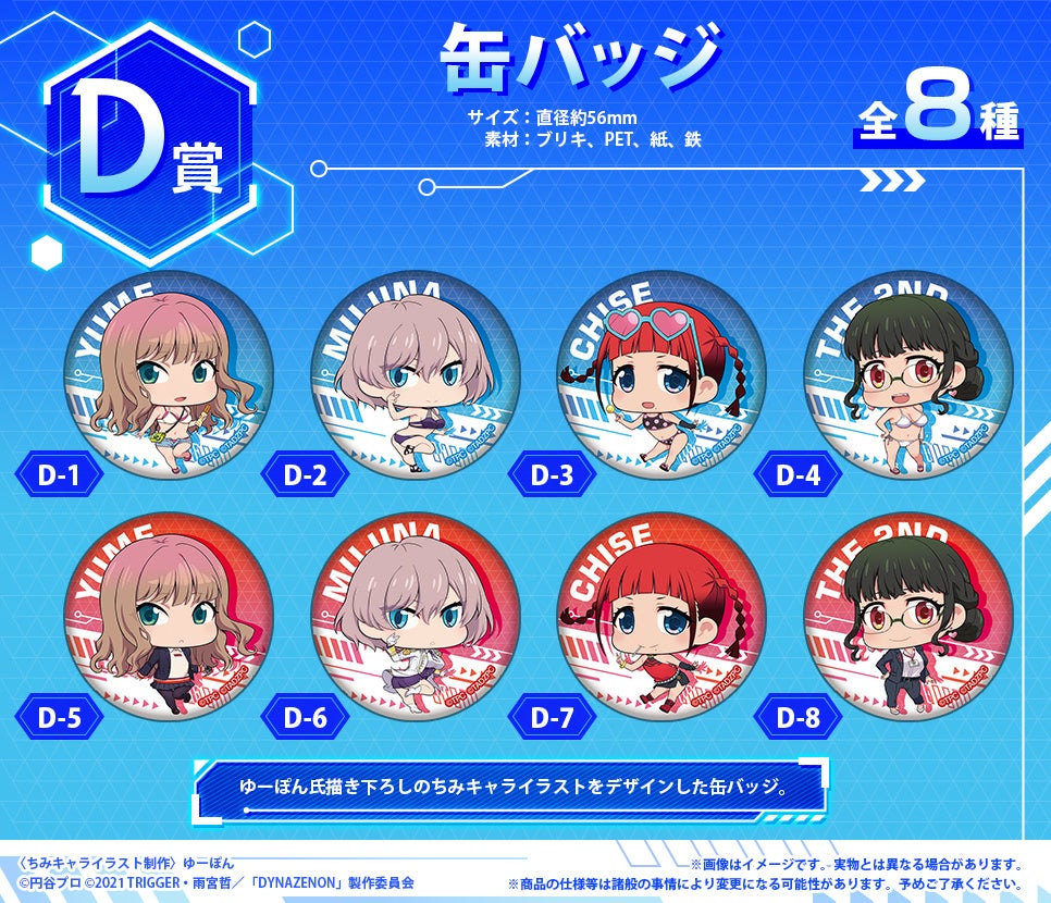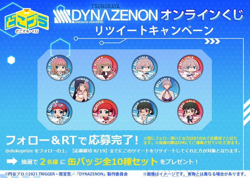 「どこプラ」公式Twitterアカウントでは、「『SSSS.DYNAZENON』 オンラインくじ」発売を記念して、抽選で2名様に缶バッジ全10種セットが当たる、プレゼントキャンペーンを実施中です。「どこプラ」公式Twitterのアカウントをフォローし、対象のツイートをリツイートしていただくことでご応募いただけます。