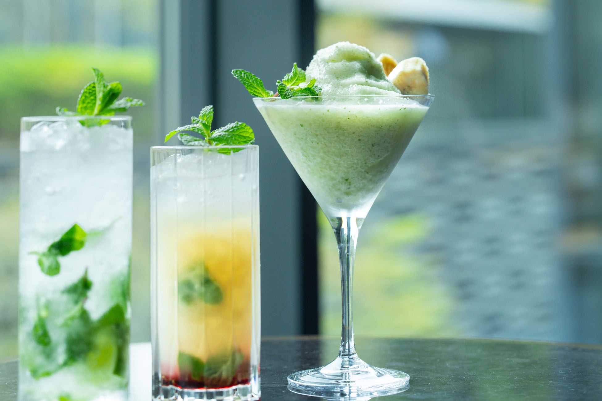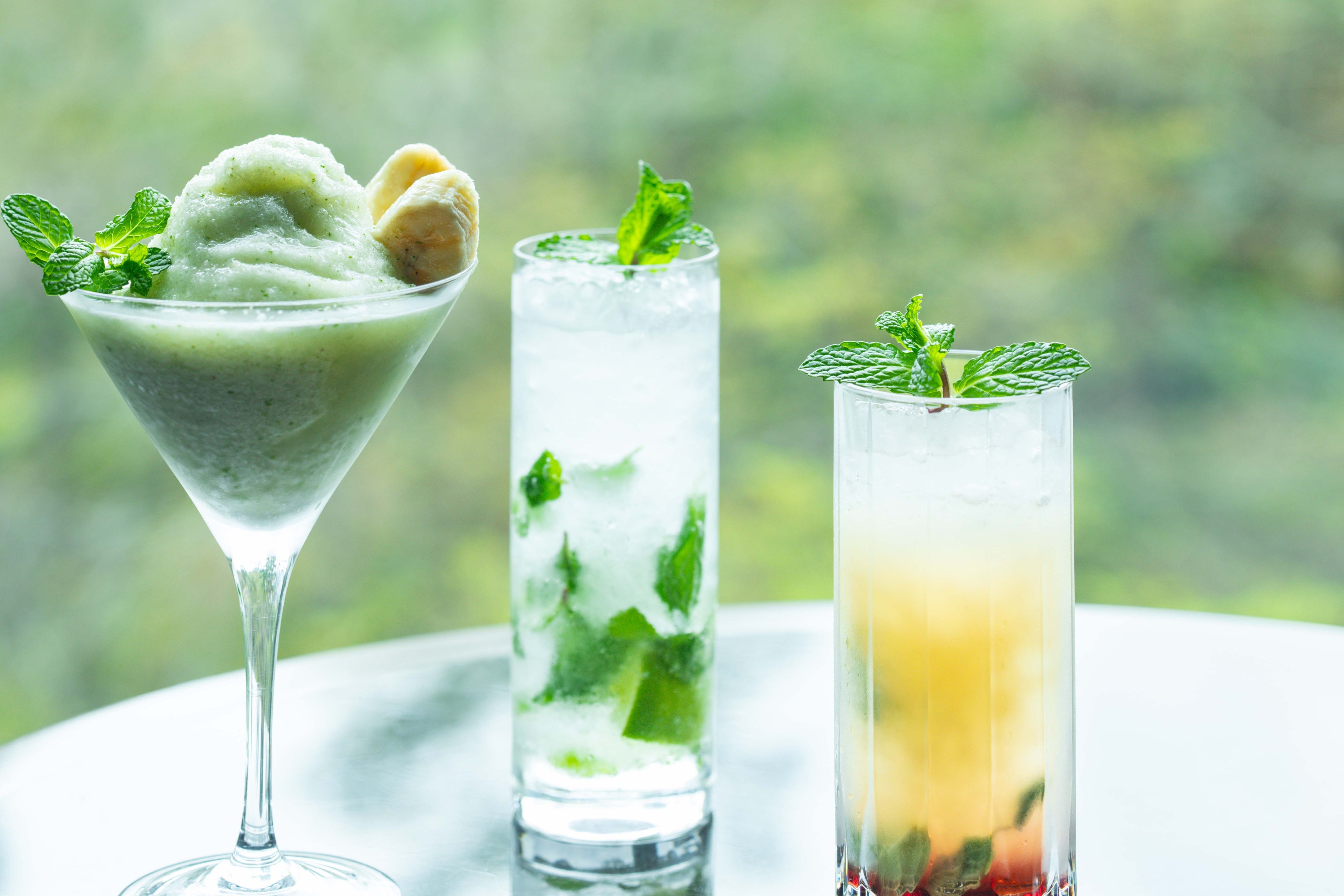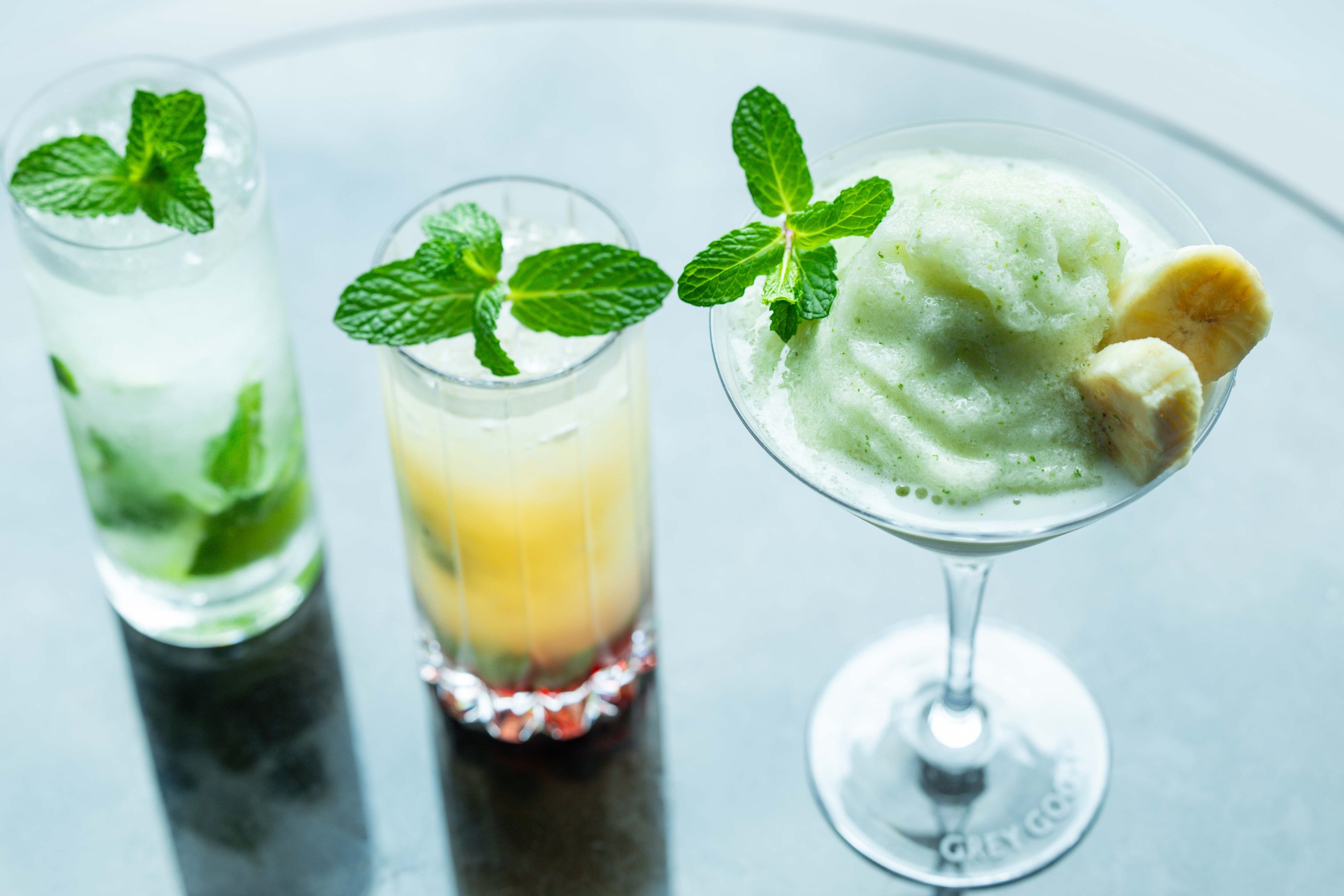 沖永良部島産の島バナナリキュールを使った新作の「バナナモヒート」。甘酸っぱい島バナナの香りに、爽やかなミントを添えたフローズンスタイルです。