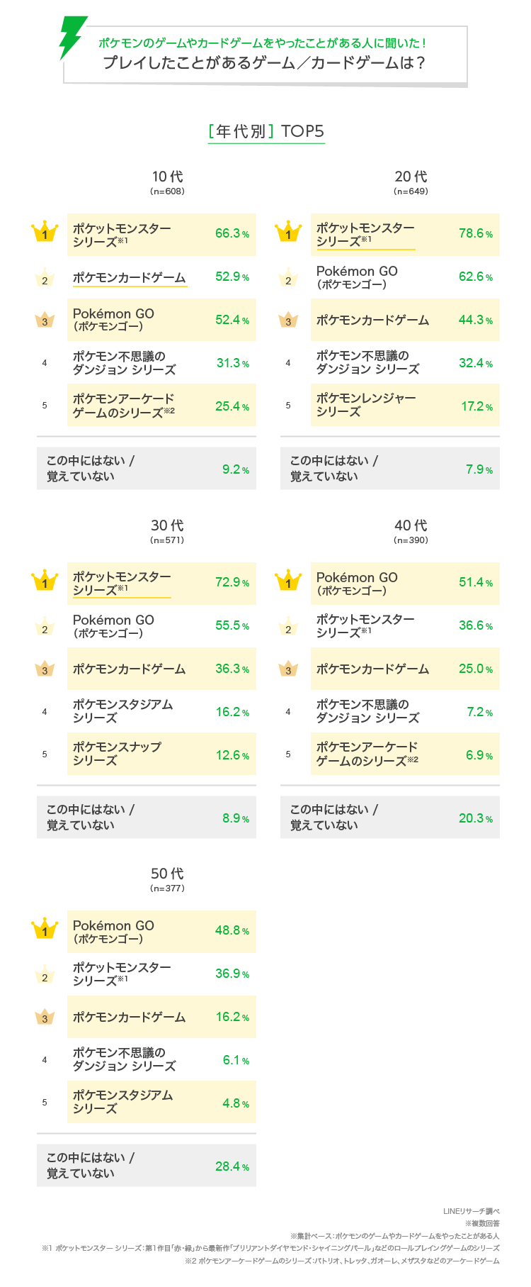 このたびLINEリサーチでは、日本全国の男女を対象に、2月27日の「Pokémon Day」にちなんで、ポケモン関連の商品やサービスを体験したことがある人の割合や、ポケモンのゲーム/カードゲームの中でプレイしたことがあるものについて調査しましたので、その結果をお知らせいたします。