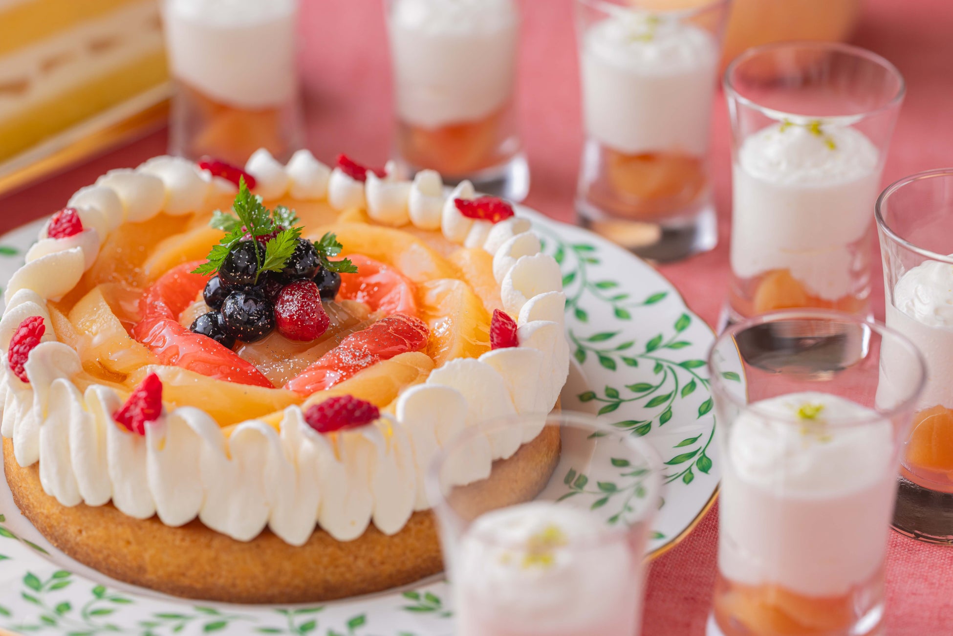 ケーキ(桃のショートケーキ、桃のロールケーキ、桃のフレジェ、桃のタルト、シャルロットペッシュ、ピーチクレープ、アナナ、桃のシフォンケーキ、桃のミルフィーユ、桃のシュークリーム、サラダフリュイ ほか)