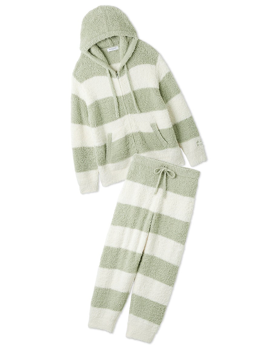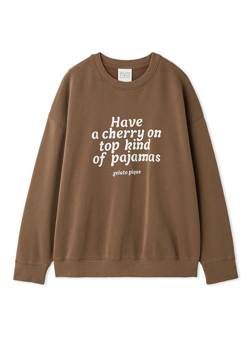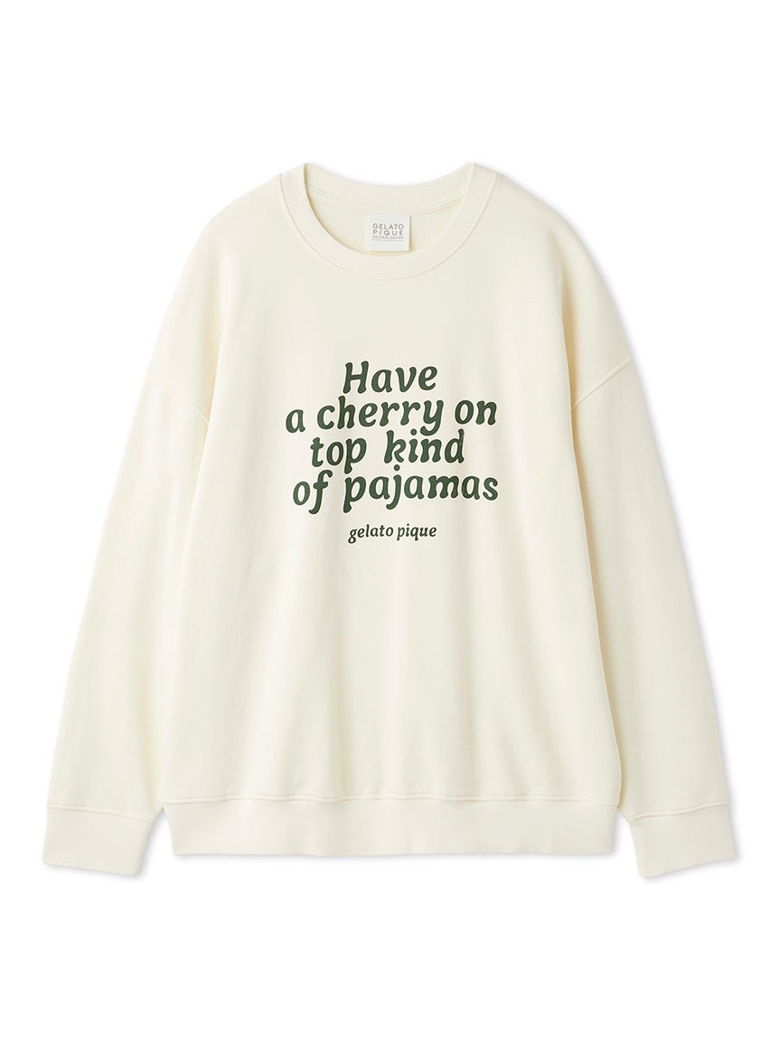 裏毛プルオーバーには、「チェリーをトッピングしたような、最高のパジャマを着る」というメッセージをプリント。チェリー柄シャツとのコーディネートで、おうちの中でも自分らしいファッションをお楽しみください。