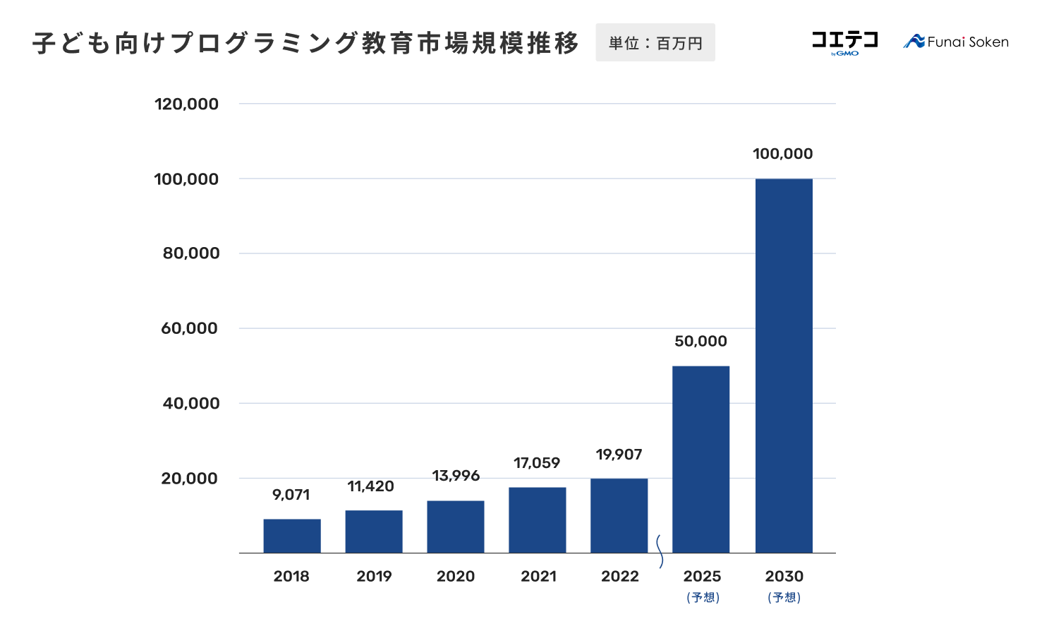 GMOインターネットグループのGMOメディア株式会社(代表取締役社長:森 輝幸 以下、GMOメディア)が運営するプログラミング教育ポータルサイト「コエテコ byGMO」(URL:https://coeteco.jp/)は、経営コンサルティングサービスを展開する株式会社船井総合研究所(代表取締役社長:真貝 大介 以下、船井総合研究所)と共同で、『2022年 プログラミング教育市場規模調査』を実施いたしました。