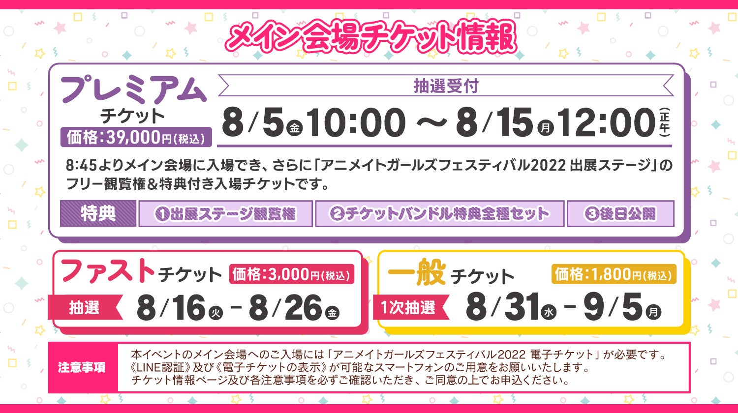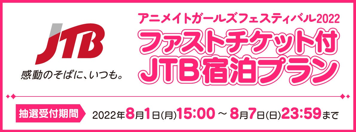8月1日からは、各種入場チケットが手に入る「アニメイトガールズフェスティバル2022ファストチケット付 JTB宿泊プラン」や「《エポスカード会員限定》アニメイトガールズフェスティバル2022 一般チケット(1)が当たるプレゼントキャンペーン」の抽選申込が開始となります。