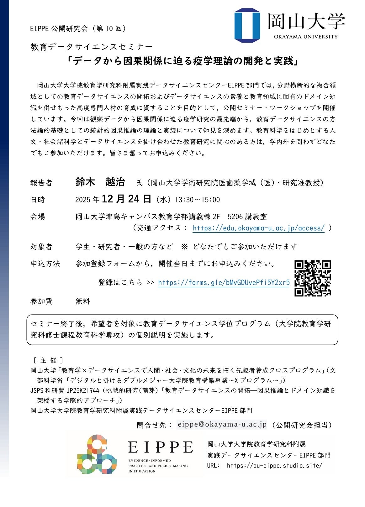 【岡山大学】教育データサイエンスセミナー「データから因果関係に迫る疫学理論の開発と実践」(第10回EIPPE公開研究会)〔12/24,水 岡山大学津島キャンパス〕