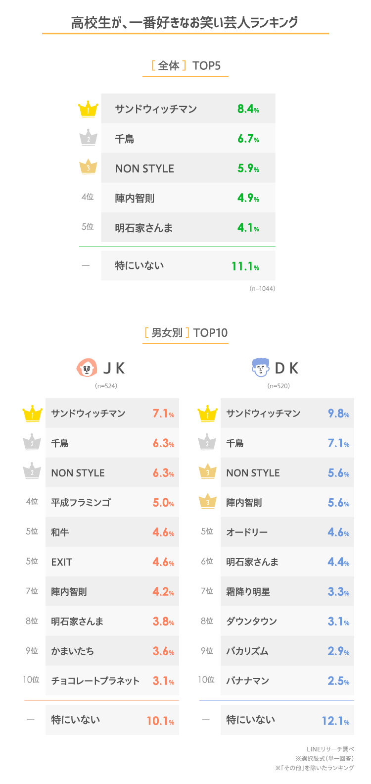 【LINEリサーチ】高校生が一番好きなお笑い芸人は「サンドウィッチマン」、これからブレイクしそうだと思うのは「錦鯉」が全体1位