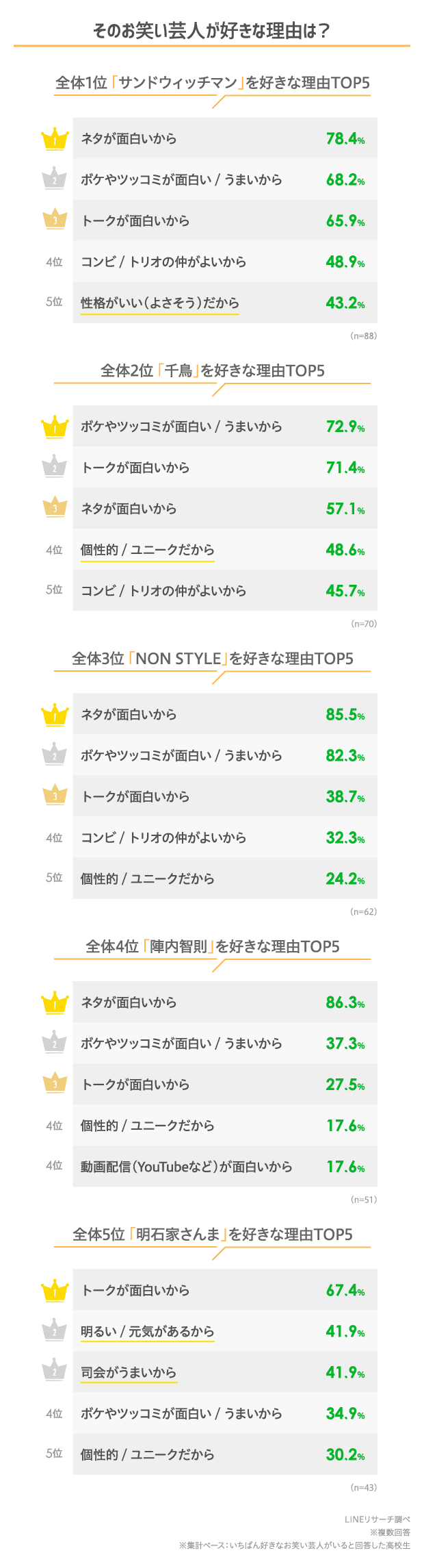 3位の「NON STYLE」では、「ネタが面白いから」「ボケやツッコミが面白い / うまいから」の割合が8割超で並んでおり、面白さも好きな理由として大きいようです。また、1位から3位までにランクインした芸人は、コンビ仲のよさも理由の一つに挙がっています。