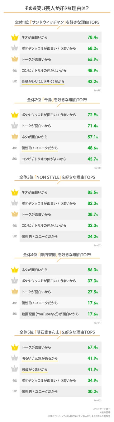 このたびLINEリサーチでは、日本全国の高校生を対象に、好きなお笑いのジャンルや好きなお笑い芸人などについて調査しましたので、その結果をお知らせいたします。