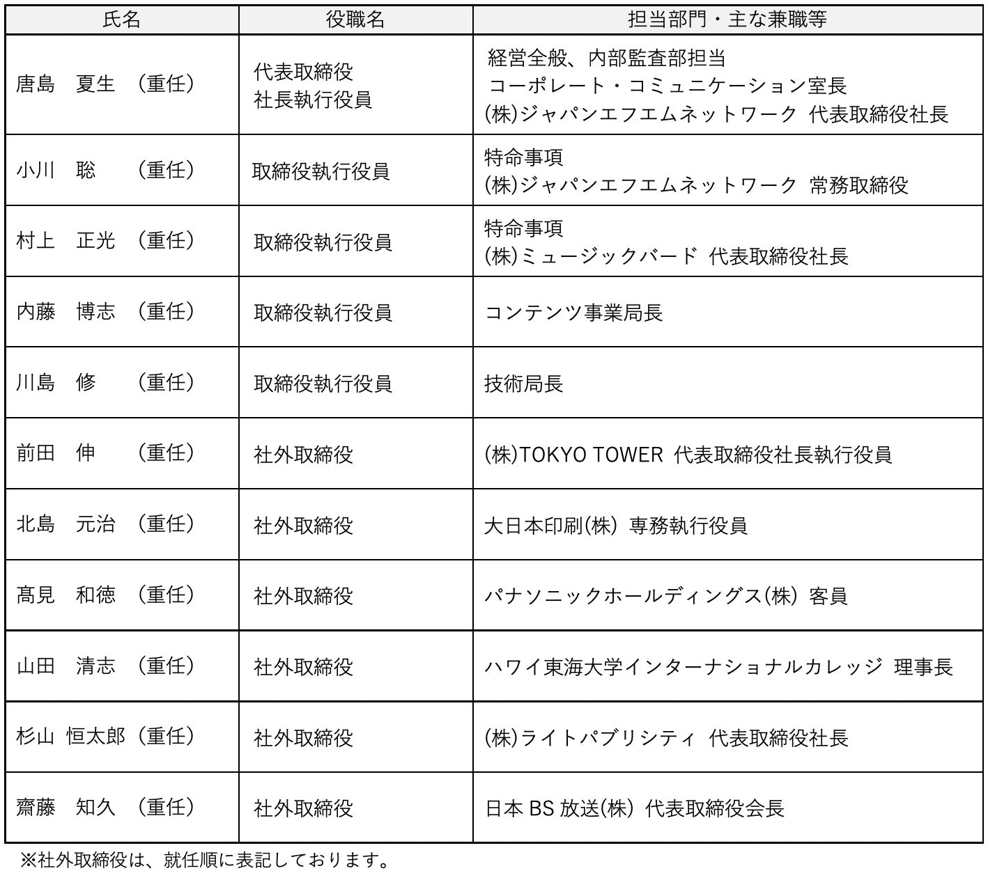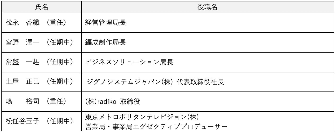 株式会社エフエム東京(本社:千代田区麹町 代表取締役社長執行役員:唐島夏生)は、6月26日(木)、第60回 定時株主総会を開催し、議案のすべてが原案どおり可決承認されました。また、その後開催の取締役会にて、別紙のとおり、当社経営体制が正式決定しましたので、お知らせします。