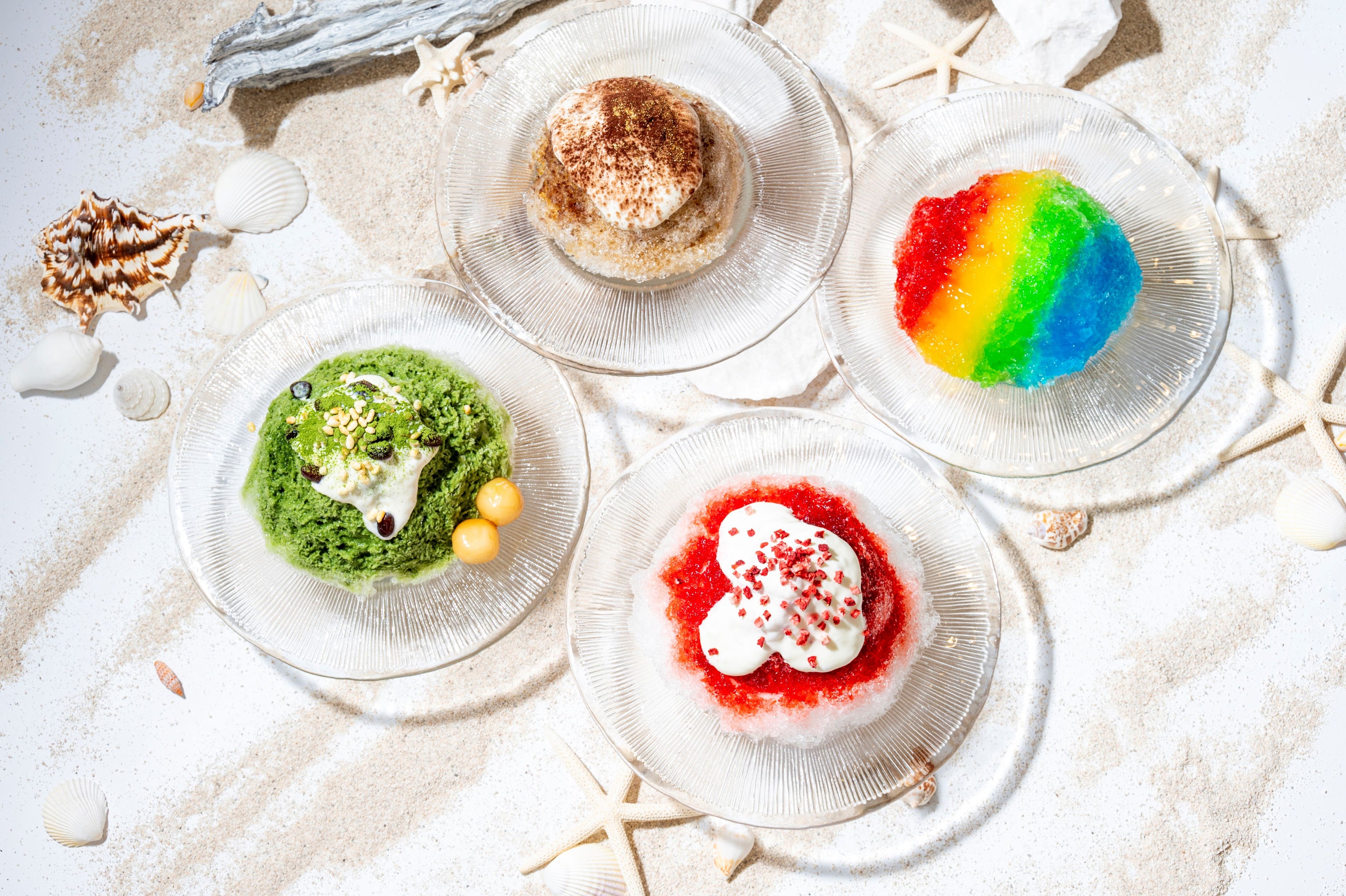 鮮やかな4色のストロベリー、マンゴー、メロン、ブルーキュラソーのシロップが織りなすグラデーションは、見た目にも涼しげでインパクトのある仕上がり。氷の中にはココナッツアイスを閉じ込め、マンゴーとパッションフルーツのソースが広がります。フルーツの甘みと酸味が調和する、爽快な夏氷をお楽しみください。