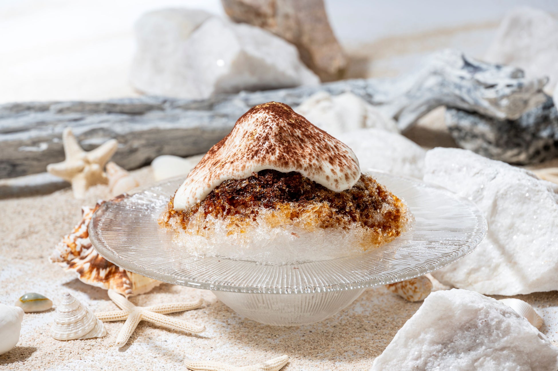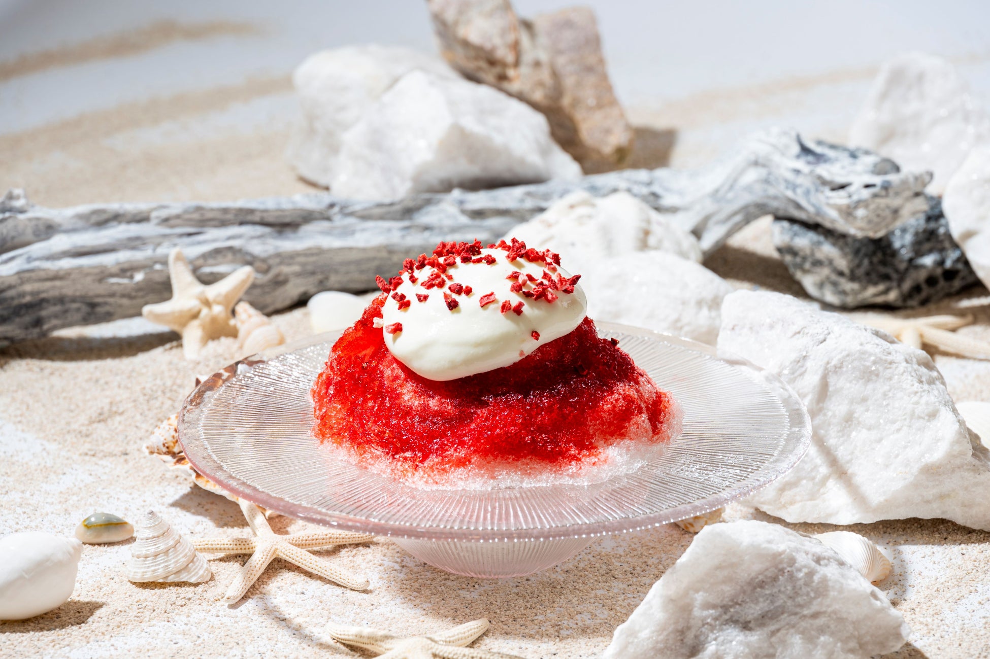 たっぷりの純氷を丁寧に削り、なかにはバニラアイスクリームをしのばせました。いちごの甘酸っぱさをぎゅっと凝縮したコンフィチュールと、ふんわり軽やかな練乳のエスプーマを重ね、層ごとに変化する味わいが魅力の一皿です。ひとさじごとに広がる、やさしい幸福感をご堪能ください。