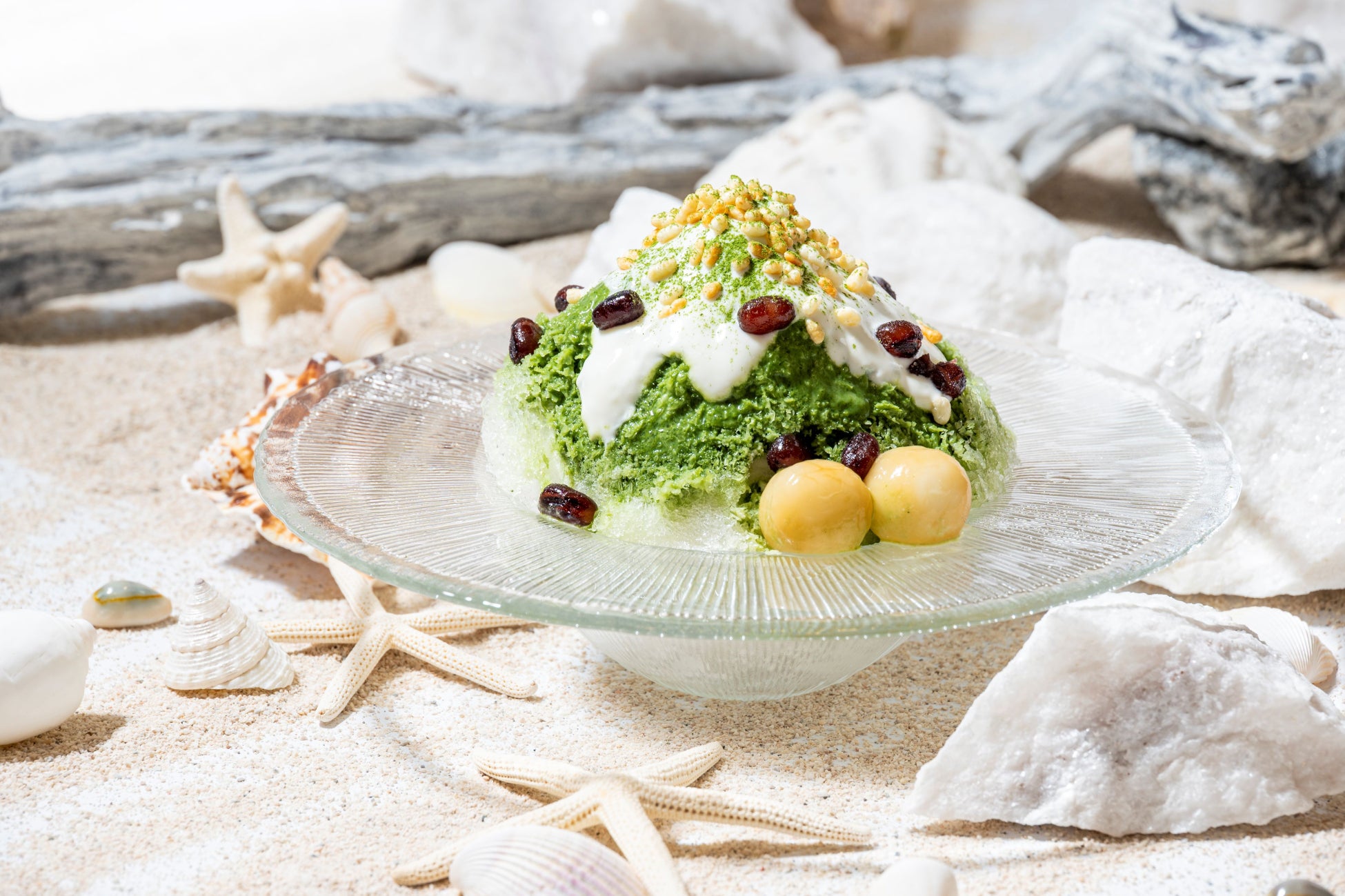 宇治抹茶の豊かな風味を引き立てたシロップに、まろやかな練乳を重ね、やさしい甘みの小倉あずきと、黒蜜が香る白玉を添えました。ひんやりとした氷を食べ進めると、黒豆きなこアイスが顔をのぞかせます。仕上げには香ばしいライスパフを散りばめ、食感のアクセントをプラス。和の趣をお楽しみいただける、凛としたひと皿です。
