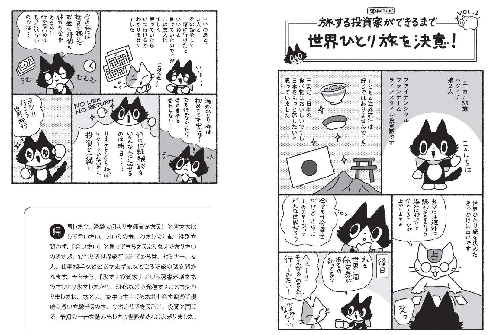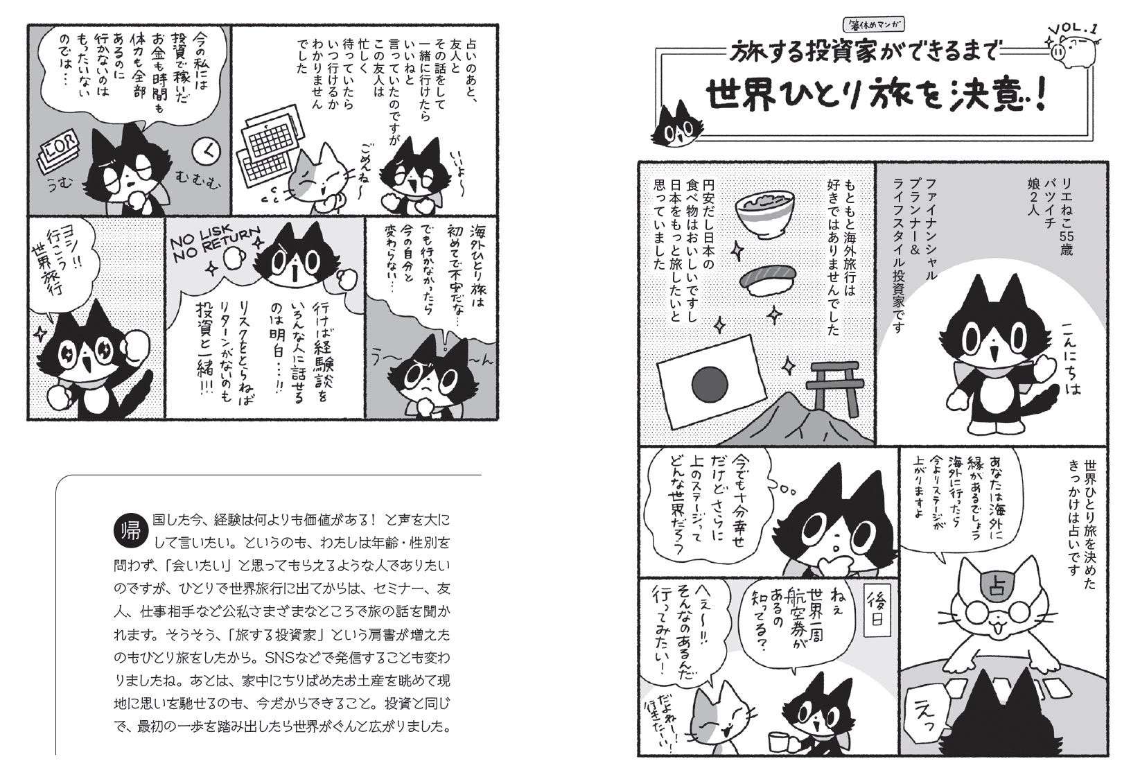 本書では、誰でも簡単にまねできる再現性の高い投資術はもちろん、「投資で世界一周ひとり旅の夢を叶えた方法」も実体験を交えたコミックエッセイで収録。お金を稼いで「自由」や「好き」を手に入れるコツがつかめる内容になっています。