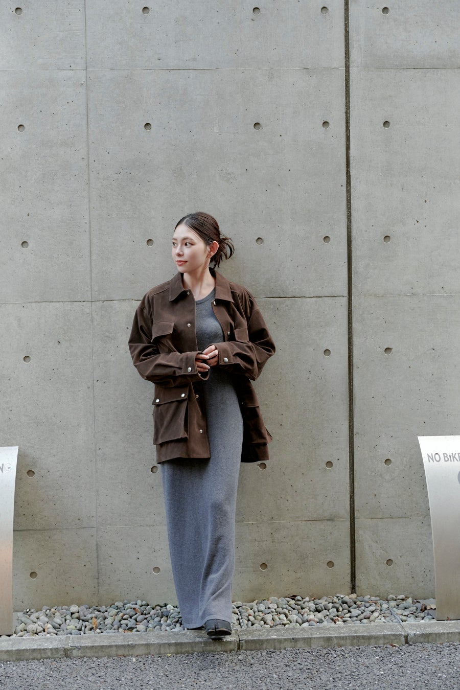 素材の高級感が際立つ落ち着いたグレーは、キレイ目スタイルから
