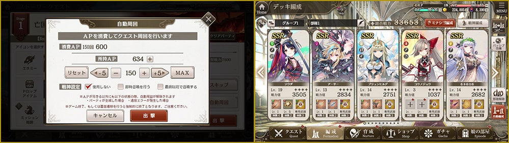 自動編成はもちろん、オートや自動周回、スキップなどの多彩なサポート機能を搭載しています。