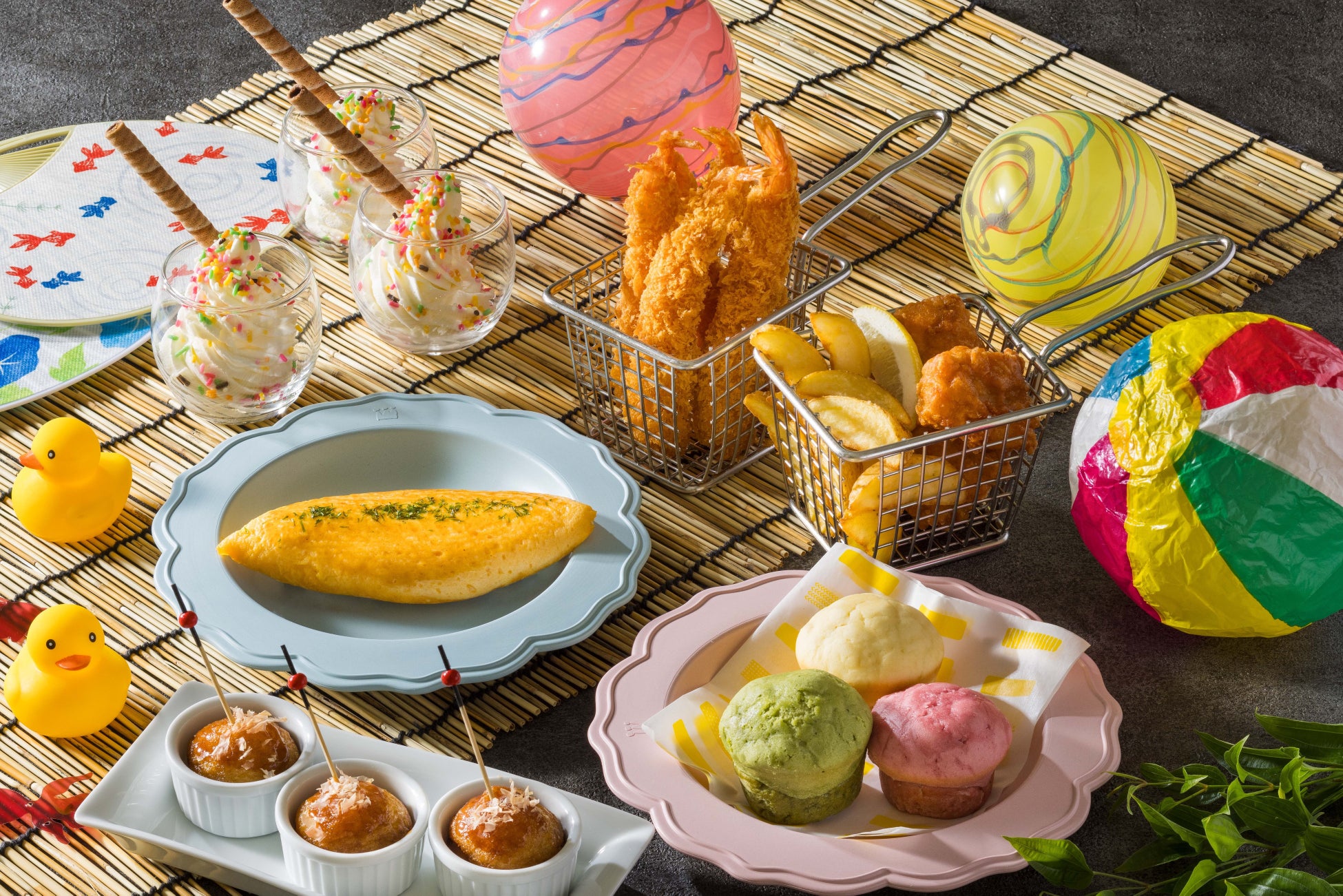 お食事は、焼きそばや唐揚げ、綿あめなど、夏祭り気分を味わえる屋台風メニューをブッフェスタイルでご提供。お子様の大好物はもちろん、大人も懐かしさを感じるラインナップで、笑顔あふれるお食事のひとときをお楽しみいただけます。