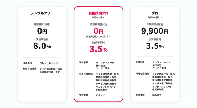 さらに、講座販売時に複数の決済手段の提供が可能となるほか、販売時の決済手数料が3.5%に割引されます(通常は8%)。加えて、スクールごとのページや複数のランディングページも作成可能となり、同一事業者内に複数の管理者がいる場合の講座管理もスムーズに行うことができるようになります。