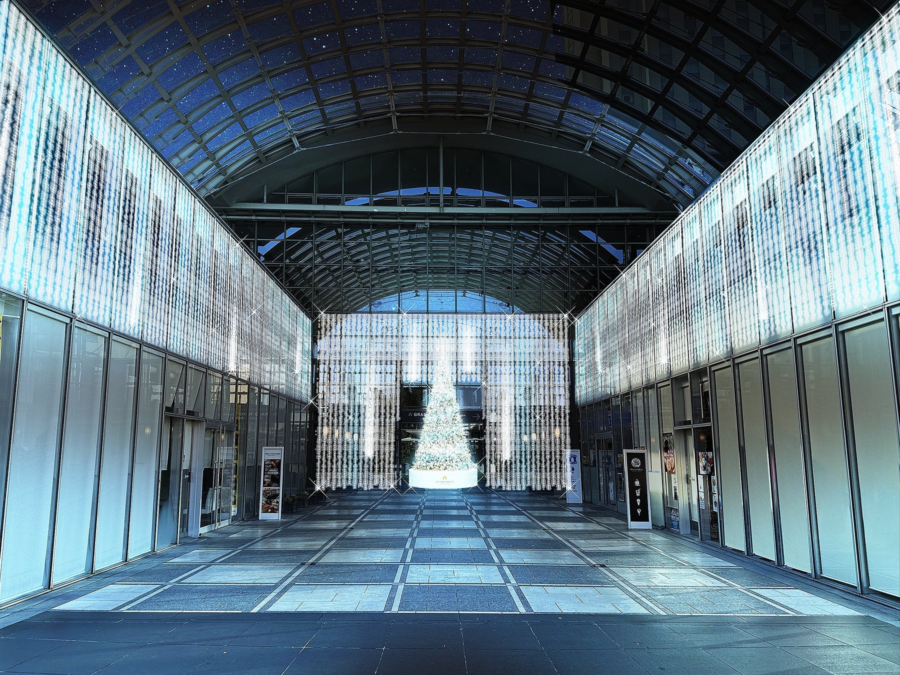 2階ロビーには10秒ごとに色が変化していく幻想的なツリー、アトリウム側のエントランスには、高さ3.5メートルを誇るホワイトカラーのツリーが飾られます。