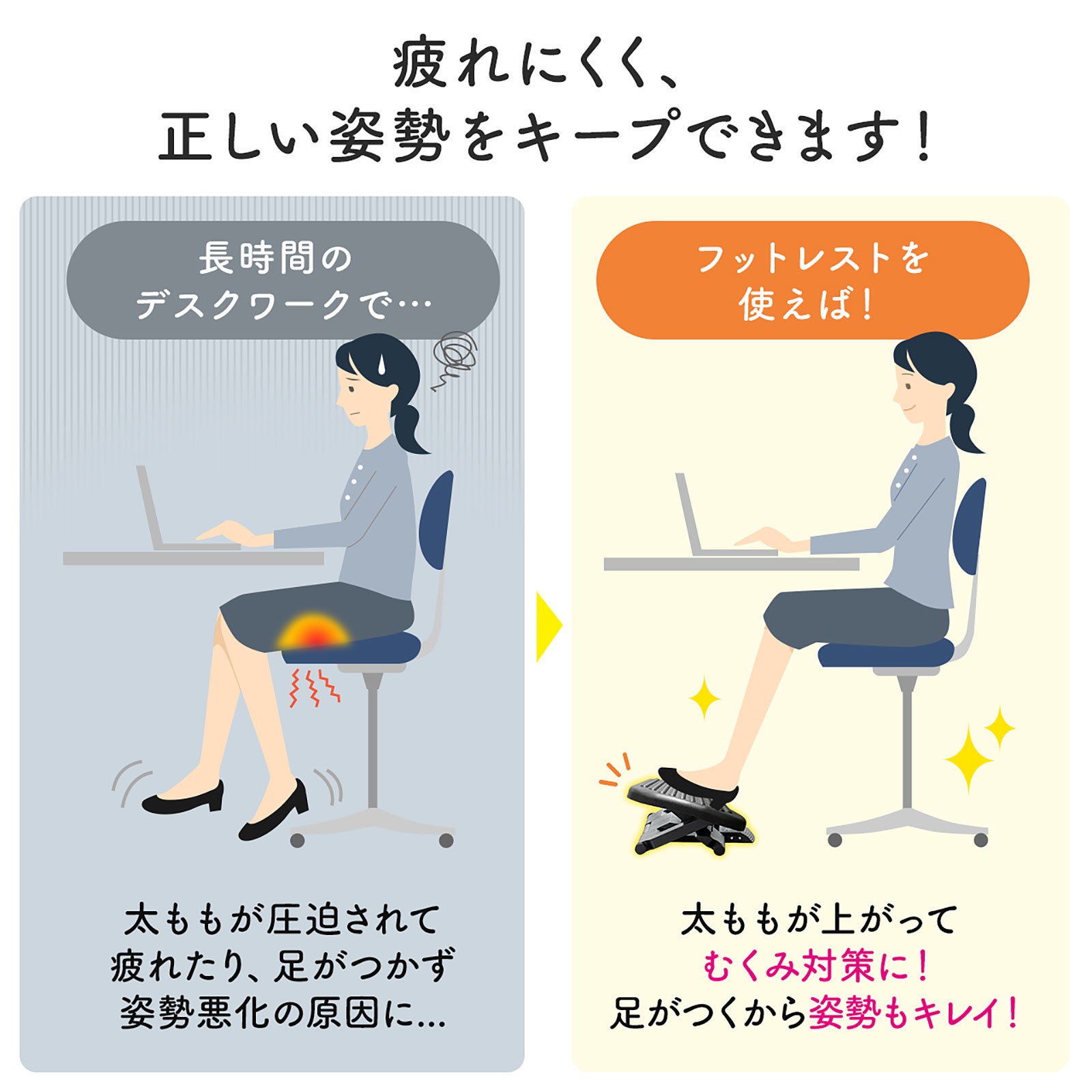 サンワサプライ株式会社(本社:岡山市北区田町1-10-1、 代表取締役社長 山田 和範)が運営している直販サイト『サンワダイレクト』では、高さを3段階調整と前後へのスイング(最大230°)で足を快適にサポートするフットレスト「100-FR028」を発売しました。