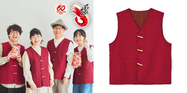 かっぱえびせん60周年を記念してデザインされた、還暦祝いのちゃんちゃんこをイメージしたベストです。