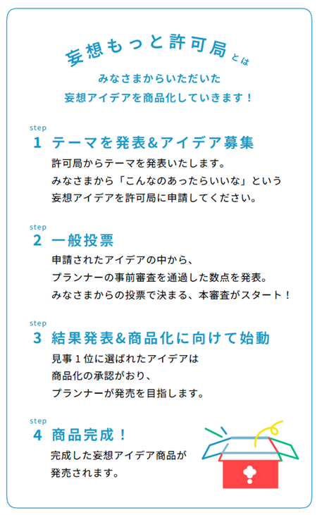 「こんなのあったらいいな」という妄想アイデアを募集し、みんなで投票して商品化を許可していくサイト。当局からテーマを発表し、事前審査を通過したアイデアから一般投票を行います。見事1位に選ばれ、商品化の承認がおりたアイデアはYOU+MORE!のプランナーが実際に商品化します。あなたの一票でヒット商品が生まれるかも!?