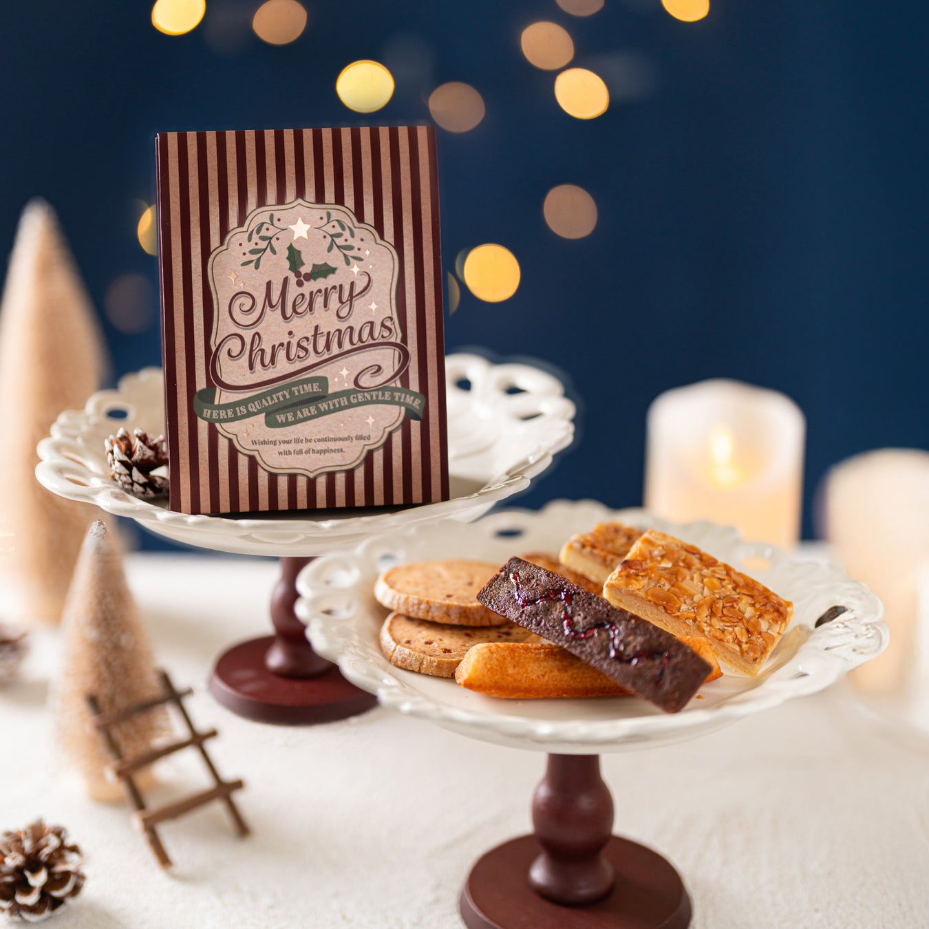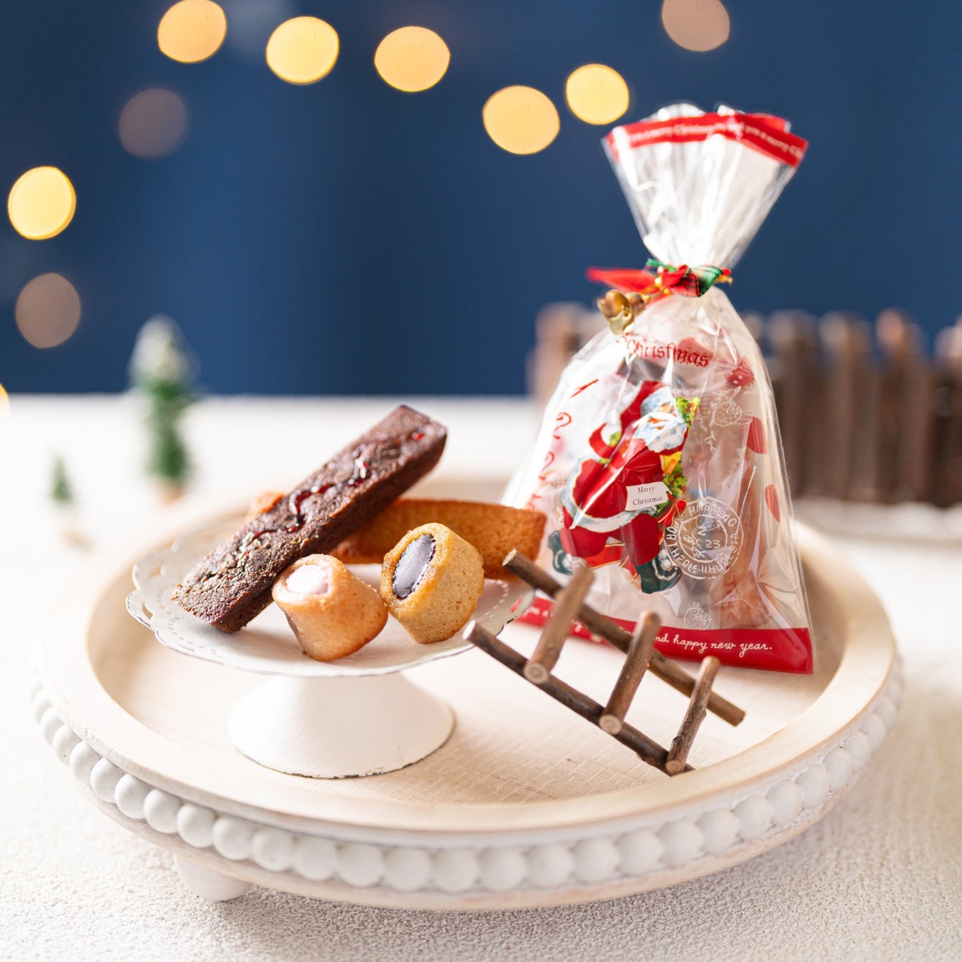 アンティークサンタのかわいらしいデザインが施されたパッケージの中には、華やかなクリスマスにぴったりのフィナンシェやティグレなど、4種類の選りすぐりのおいしさが詰め込まれています。