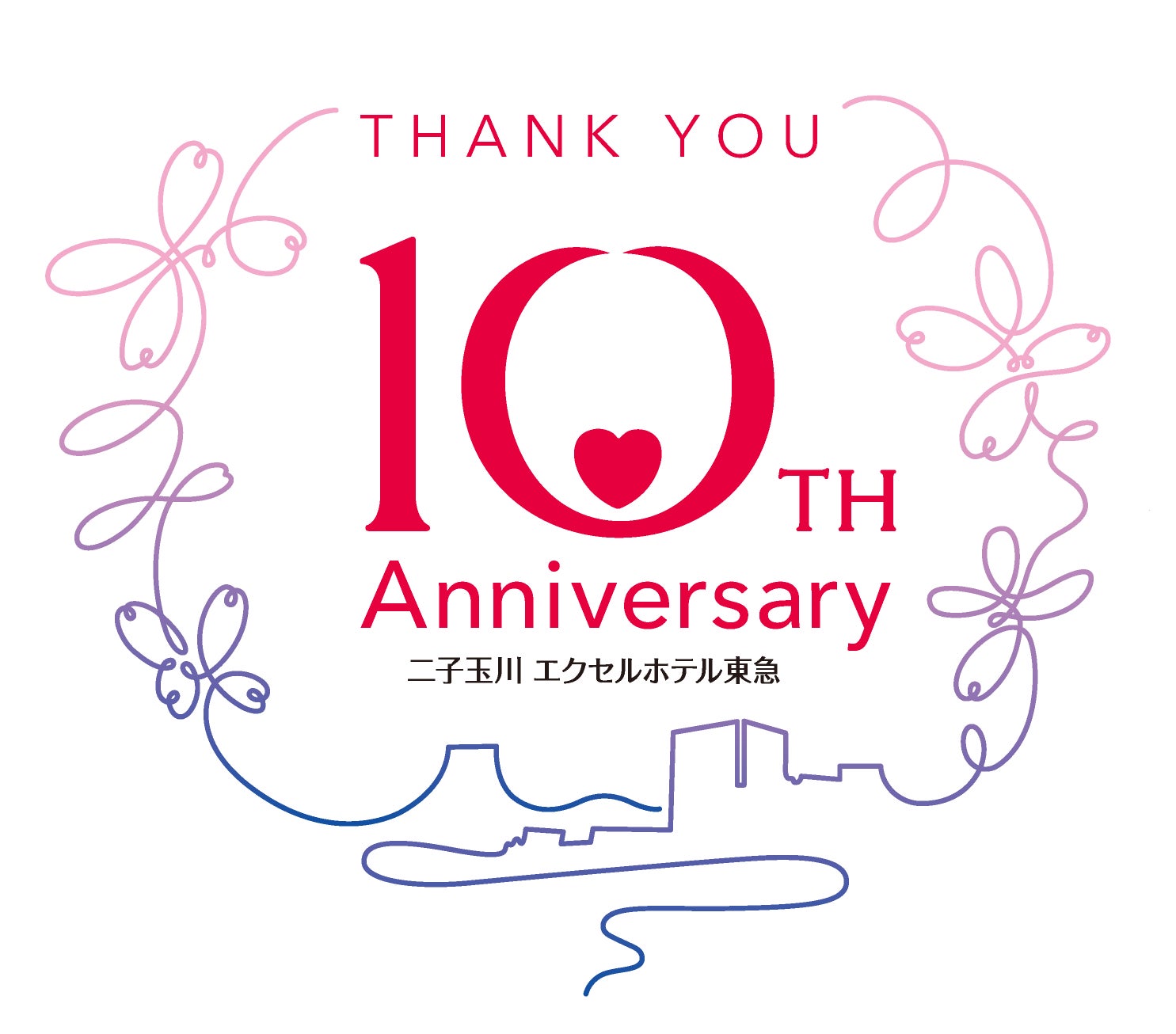 10周年の感謝の思いと、二子玉川のシンボルツリーである「ハナミズキ」やホテルからの展望、多摩川の流れのような曲線を通じて、「二子玉川」とともにあり続けてきたホテルであることを表現。ピンクから徐々に青に変化するグラデーションは、流れる時間帯によって変化する街の様子を表しています。また、ゼロの内側にあるハートは、「ハナミズキ」のつぼみをイメージし、これからの更なる飛躍を皆様に約束するという思いを託しました。