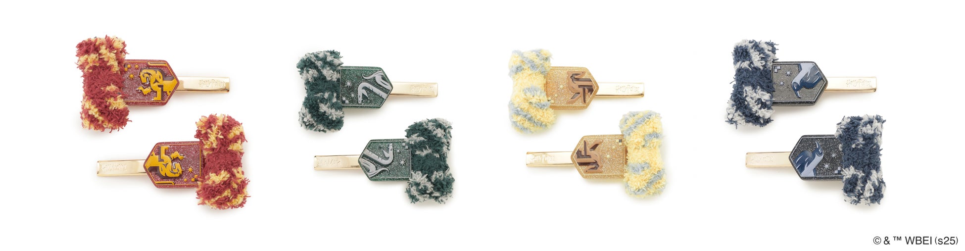 各寮のエンブレムをあしらった2本組のヘアクリップセット。グリッターがきらめくエンブレムに、同シリーズのニットウェアと同じ素材のふんわりとしたリボンをあしらいました。