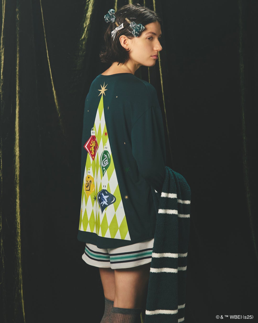 なめらかなカットソーにプリントしたソックス柄に、各寮のロゴとシンボルをデザインしました。背面には大きなクリスマスツリーに4寮のシンボルを飾った、季節感たっぷりのオリジナルグラフィックをプリント。