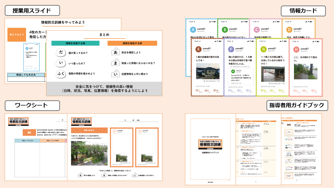 今回は、その第2弾として、災害時の適切な情報発信の方法について学ぶ教材「情報防災訓練(情報発信編)」を開発しました。教材では、実際に災害が起きたと想定し、用意された「情報カード」を見ながら発信して良い内容、しない方がいい内容を話し合うグループワークを行った上で、「あまい(安全を確認しよう・間違った情報にならないかな・位置情報を上手に使おう)」というキーワードを使って、情報を発信する際に気を付けるポイントが学べるようになっています。