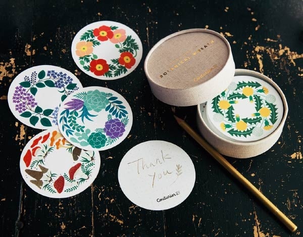樋口 愉美子さんが手描きした12種類のリースの原画をプリントしたメモ用紙のセットを最終月にもれなく購入者全員にプレゼントします。各図案×10枚ずつ、合計120枚のメモ用紙が、箔押しの箱に入っています。
