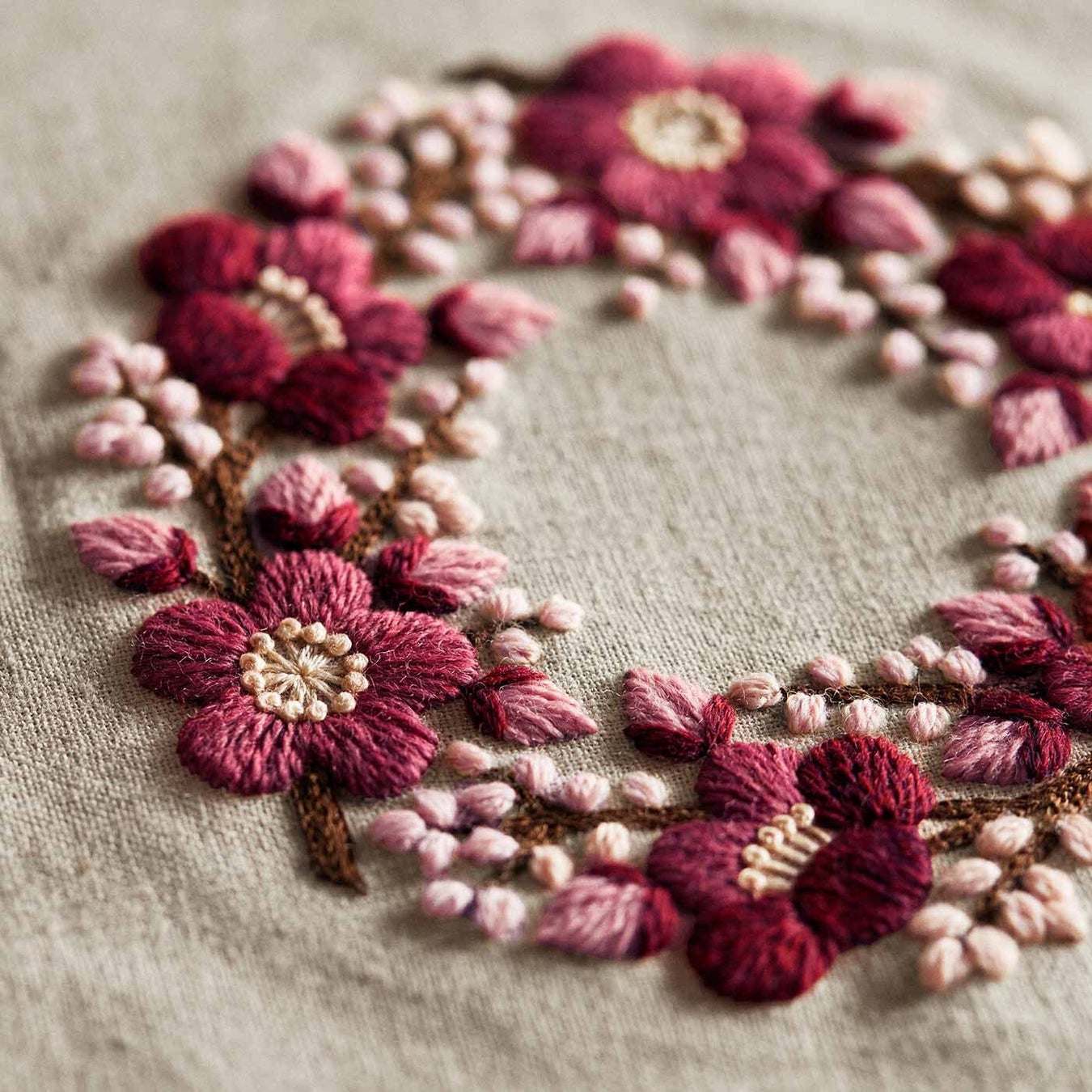 古くからリースは豊作、魔除け、幸福を願うお守りとしてさまざまなシーンで用いられてきました。始まりも終わりもないフォルムには、永遠に時を刻むという意味が込められています。DMC社の新しい刺しゅう糸「エコヴィータ ウールスレッド」を使って、12ヵ月の植物のリースを色彩豊かに描きました。メリノウールのあたたかな質感と、自然の染料から生まれたやさしい色合いを、ぜひ体験していただければと思います。刺しゅう枠に入れてお好みの場所に飾れば、空間を華やかにしてくれることでしょう。ひと針ひと針ていねいに進めていく時間は、穏やかな時の流れを感じさせてくれることでしょう。心豊かになれる刺しゅうの時間を、どうぞお楽しみください。