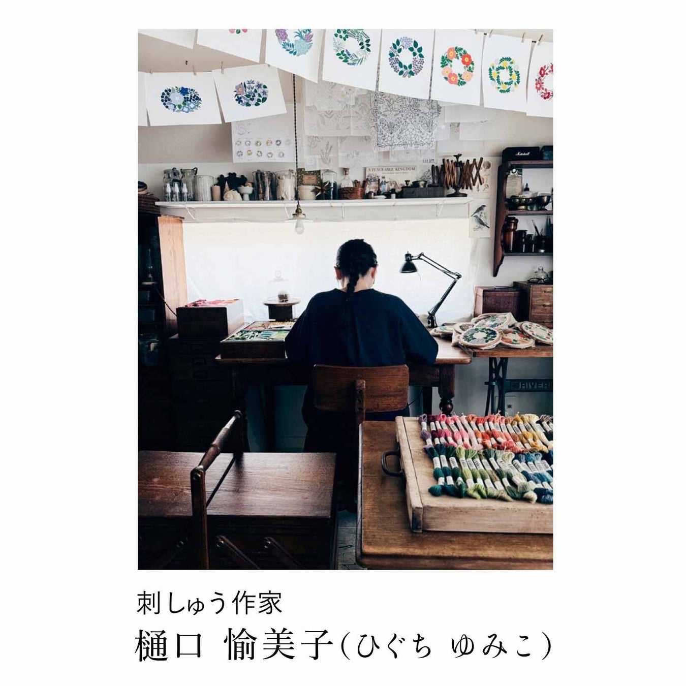 刺しゅう作家。多摩美術大学卒業後、ハンドメイドバッグデザイナーとして活動した後、2008年より刺しゅう作家に。自然に対する愛情が深く、日々の暮らしの中、五感を使って季節を感じる取ることを大切にしながら、表情豊かな刺しゅう作品を発表している。著書に『樋口愉美子 つながる刺繍』『樋口愉美子 暮らしの刺繍』(共に文化出版局)』ほか多数。