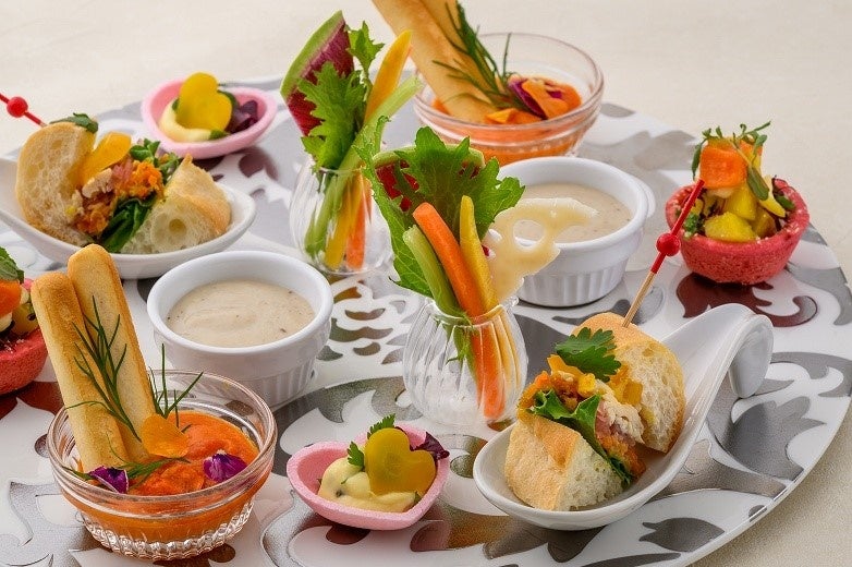 2種類のサツマイモに柚子が香る暖色のウォームカラータルトと、唐辛子の辛さとパッションフルーツの酸味が絶妙なチーズディップを詰めたハート形のモナカは、テーマに紐づけられた温かさをイメージしています。人参のムースは、暖炉の中で煌々と燃える焚火を表現しました。ベトナム風バゲットサンドのバインミーには、マスタード風味の蒸し鶏やレッドキャベツマリネのほか、血行促進の効果が期待できるクミンや生姜を入れてアクセントにしています。根菜のバーニャカウダ風には、温かいソースをつけてお召し上がりください。