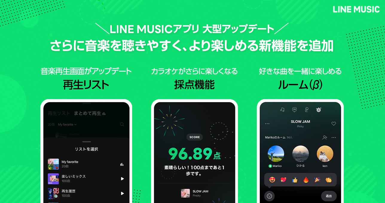 LINE MUSIC株式会社(所在地:東京都新宿区、代表取締役社長:舛田 淳)は、当社が運営する音楽ストリーミングサービス「LINE MUSIC」アプリ(iPhone・Android対応)において、再生プレイヤーを強化するほか、カラオケを採点する「採点機能」、新機能「ルーム(β)」を新たに提供するアップデートを実施いたしましたので、お知らせいたします。