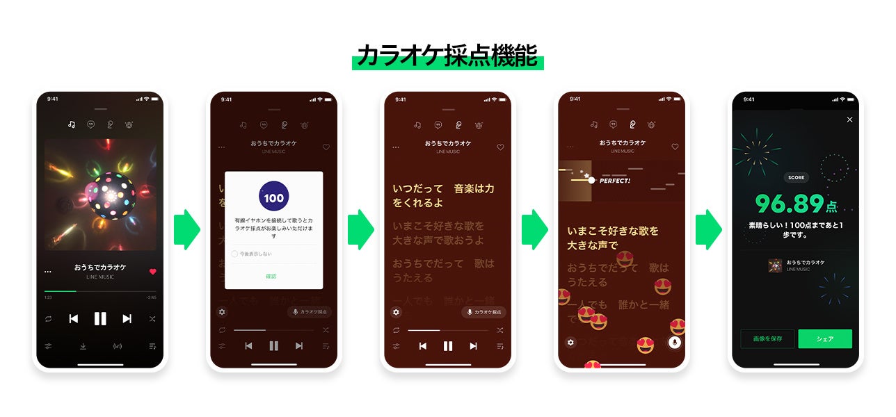 採点機能では、ユーザーの歌声をAI機能でリアルタイムに音程を測りながら、最後まで歌い終えるとスコアリングデータが収集され、カラオケの採点結果が集計されます。点数に合わせた3種類のエフェクトも登場するほか、高得点の場合にはスペシャルな採点画面も登場します。採点結果はSNSやLINEの友だちへシェアすることも可能です。