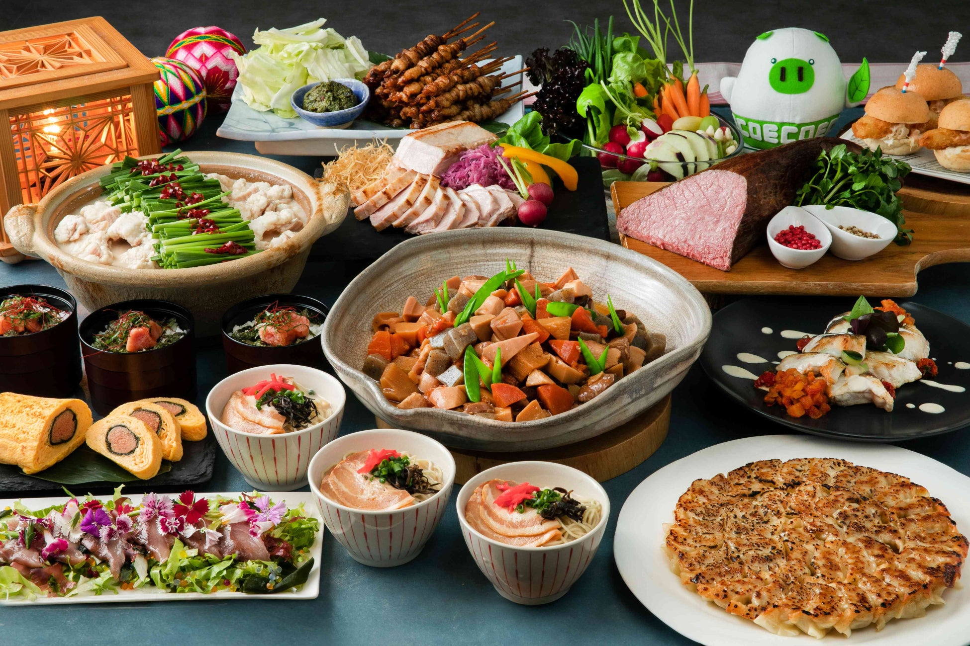 各種料理:博多とんこつラーメン/一人一皿(D)、銘柄鶏「博多華味鳥」の鶏すき(D)、糸島産魚介類と野菜のアクアパッツア(L)、一口餃子(L/D)、福岡名物「ごまさば」(L/D)、もつ鍋(L)、がめ煮(L/D)、糸島市やますえの辛子明太子と福岡有明のりのめんたいお重(D)、鶏皮のぐるぐる巻き(L/D)、大川市「庄分酢」の赤酢を使用したちらし寿司(L/D)、「博多和牛」バラ肉のビーフシチュー(D)、北九州名物焼きラーメン(L)、かしわ飯(L)、「八女抹茶」のブランマンジェ(L/D)ほか ※L=ランチ/D=ディナー