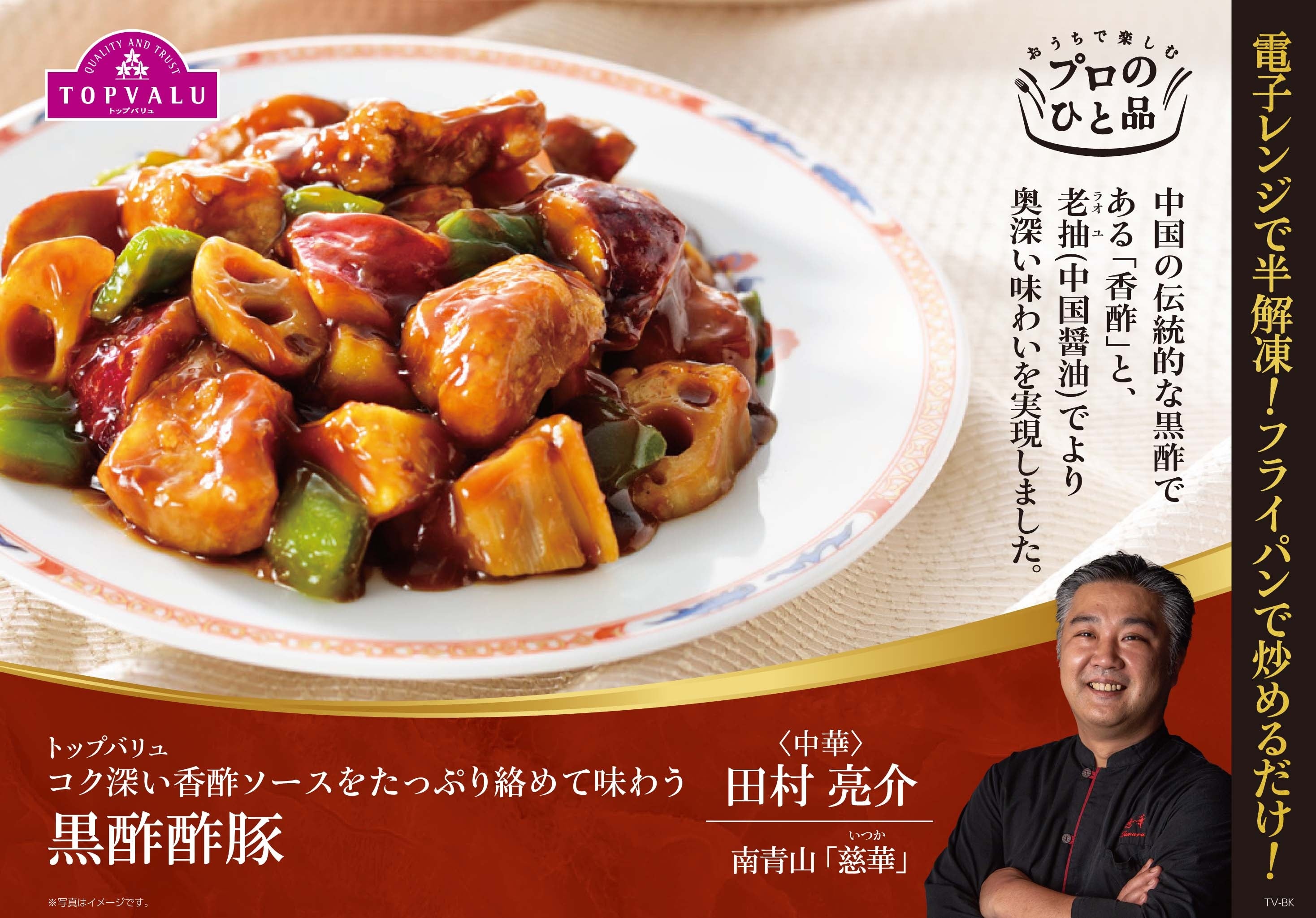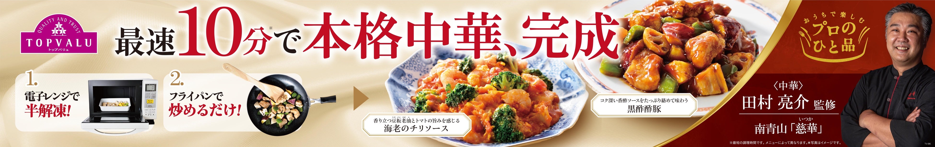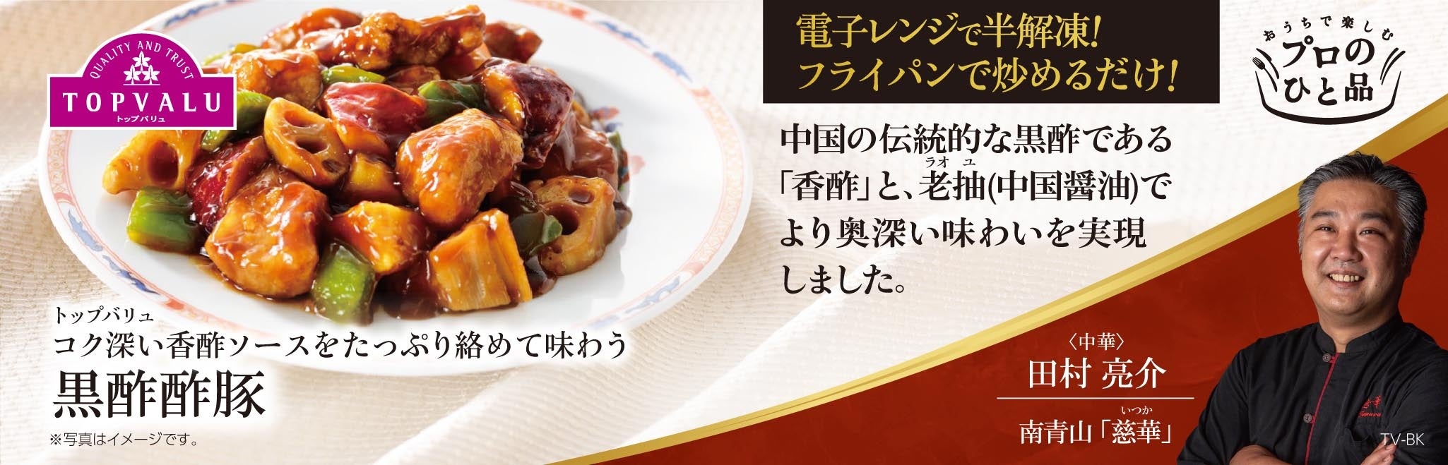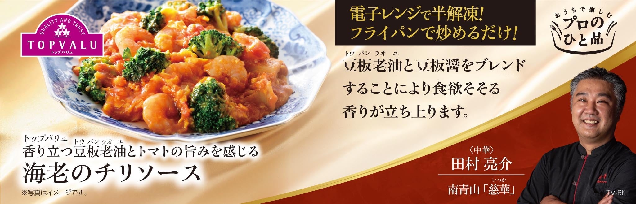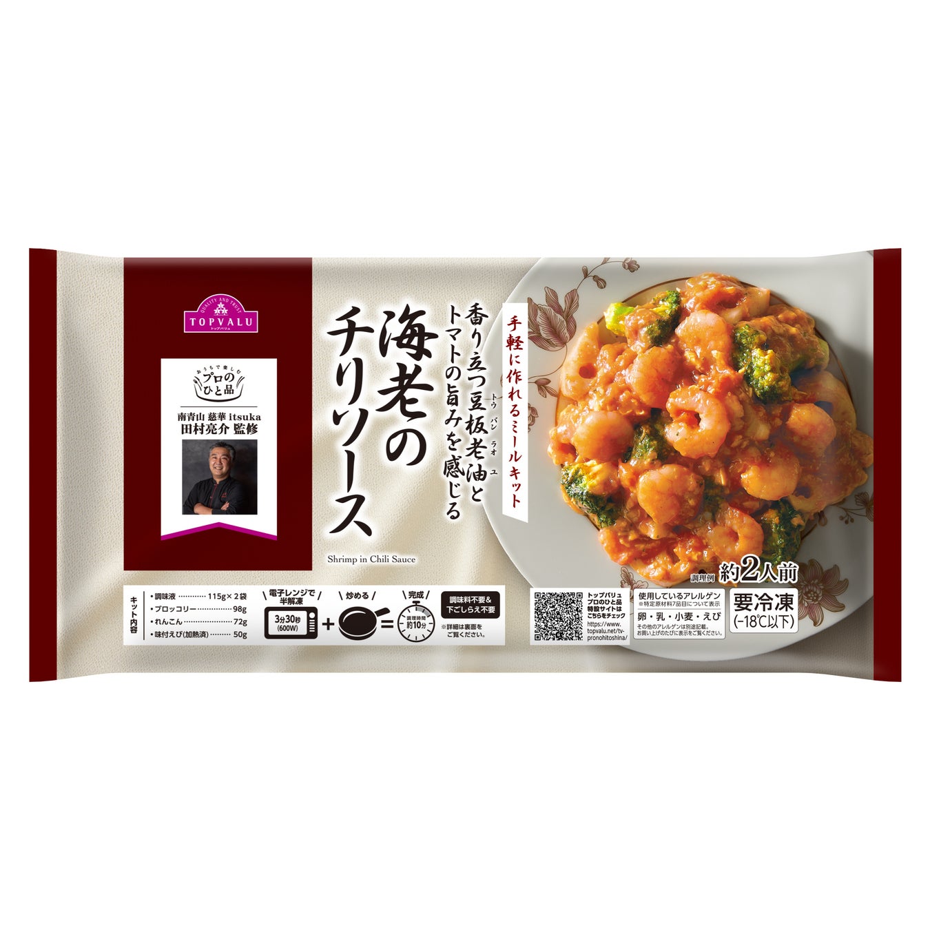 イオンは2月15日(水)、「イオン」「イオンスタイル」「マックスバリュ」など全国約1,500店舗※1)にて、「プロのひと品」シリーズ初の“冷凍ミールキット”南青山「慈華(いつか)」田村亮介シェフ監修「トップバリュ 香り立つ豆板老油とトマトの旨みを感じる海老のチリソース」と「トップバリュ コク深い香酢ソースをたっぷり絡めて味わう黒酢酢豚」を発売します。