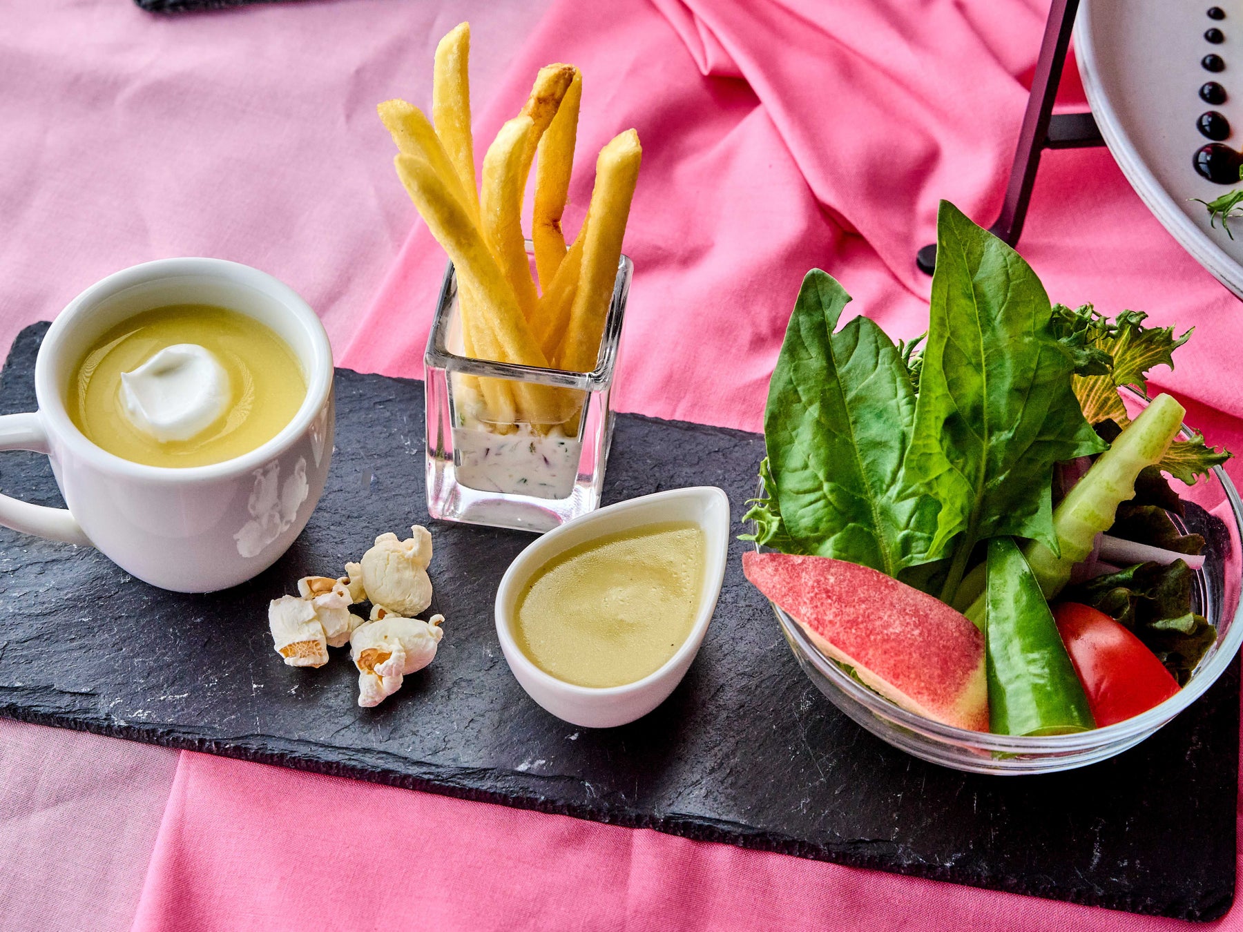 ウェルカムプレートは、神奈川県近郊野菜を使用したサラダをご用意。桃香る梅ドレッシングでさっぱりとした味わいに。コーンの自然な甘味を存分に楽しめる冷製スープは、お好みでポップコーンを加えることで、食感のアクセントが加わり、より一層美味しくお召し上がりいただけます。