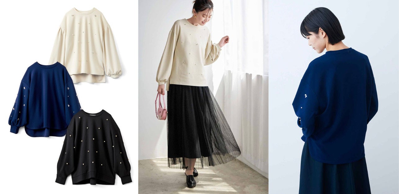 着心地はまるでスウェット、なのにきれいな表面感のカットジョーゼットできちんと感のある生地感のトップスです。 ビジューのデザインだけでなく、袖のタックやすそのデザインなど、色ごとに異なるディテールが楽しめます。どんなボトムスも受け入れるシルエットで、きれいめにまとめるもよし、デニムとの甘辛コーデもキマります。