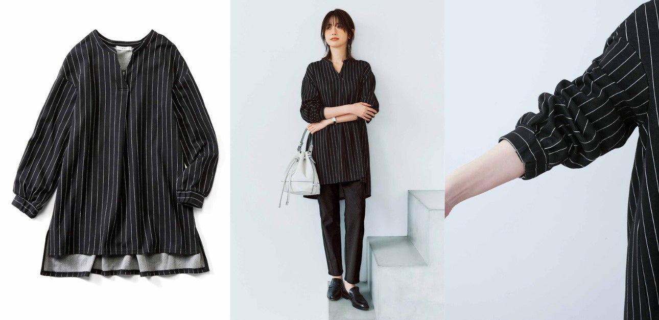 ドロップショルダーでわきを前に振ったオーバーサイズのゆるシャツは、素材と相まって快適な着心地です。シャープな配色のピンストライプ柄、バンドカラー、大きく前後差をつけた長めの丈、自然に背中へ抜ける衿もとなどで、きちんと感とこなれ感のバランスが整っています。発売以来大人気の、美脚を極めたエアノビテーパードパンツと合わせることで細見えのすっきりとしたシルエットに。