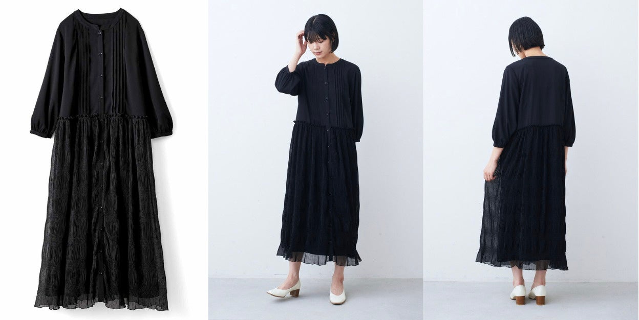 夏から秋へと季節をつなぐ七分袖のワンピースです。スカート部分にシアーな楊柳(ようりゅう)素材でふわりと旬感をまとわせたモードなデザインは、一枚でドラマティックに着こなせます。身生地は落ち感のあるポリエステル生地で軽やかに着られて、ボタンを開ければはおりとしても着まわせます。