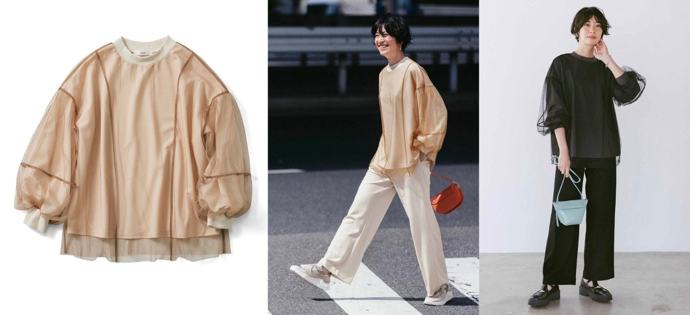 旬のシアー素材を秋でも楽しめる新鮮なデザインのカットソートップスです。カットソーにチュールを重ねており、シンプルに着られるのに着映え感も抜群。ぽわんとしたボリューム袖が女性らしく、メリハリを作るチュールの切り替えラインがきりりとモード。カットソーだけをすそインしてチュールをひらりと泳がせたり、多彩な着方を楽しめます。とろぷるパンツと合わせて、上下セットコーデに。