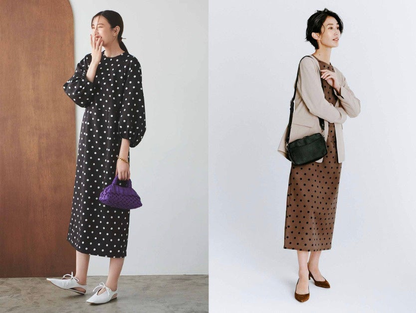レディーなシルエットとプリント柄で華やぐドットワンピース