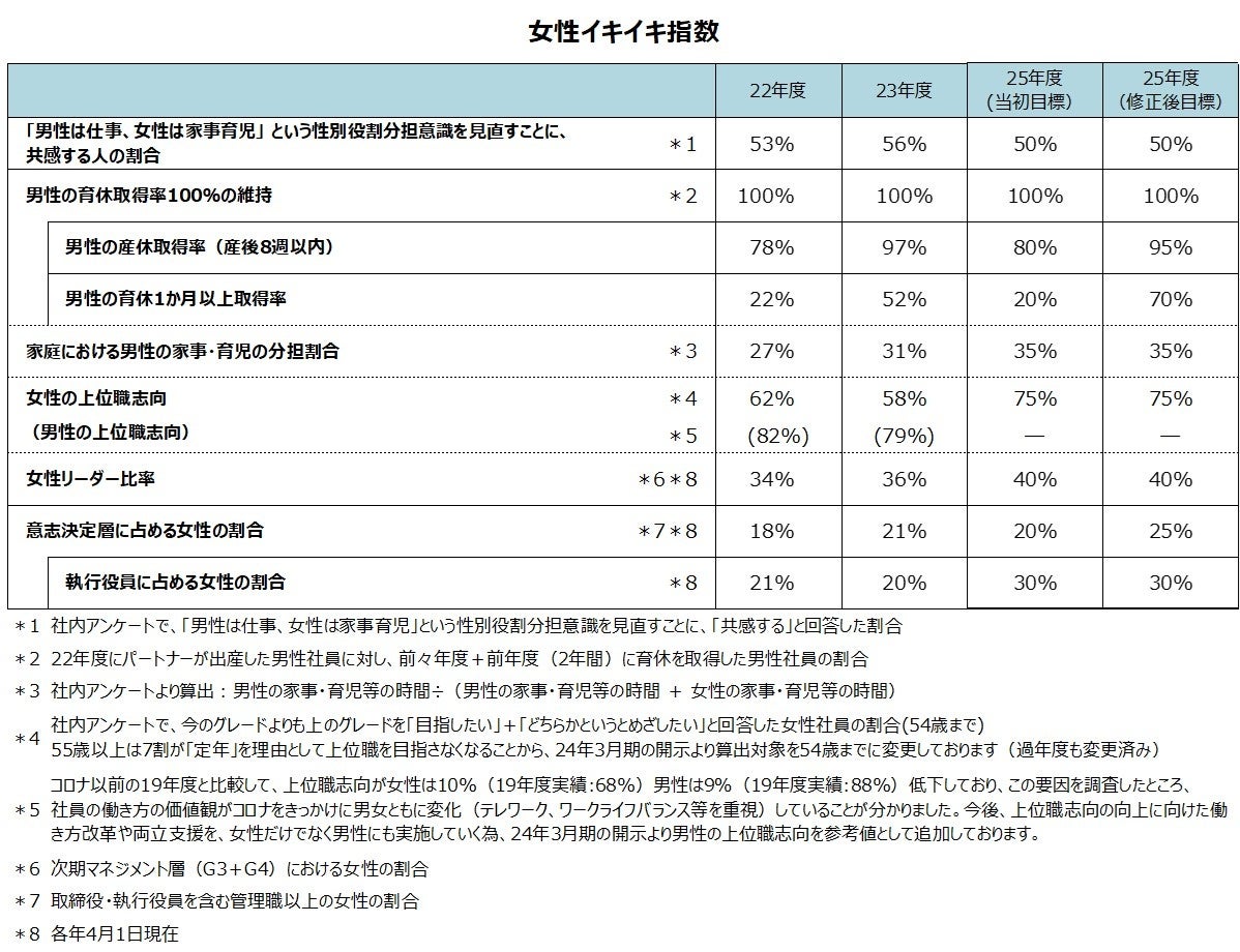 経営の基盤となる企業文化を古いものから更新するために「企業理念の制定・浸透」「働き方改革」「多様性の推進」「手挙げの文化の醸成」といった取り組みを同時に進め、「多様性の推進」については、“画一的な組織からはイノベーションは生まれない”という考えのもと、男女・年代・個人の3つの多様性を掲げ、組織改革を推進してまいりました。2013年度より女性活躍の重点指標として「女性イキイキ指数」を設定、2025年度までの目標数値を掲げ、取り組みを可視化しております。