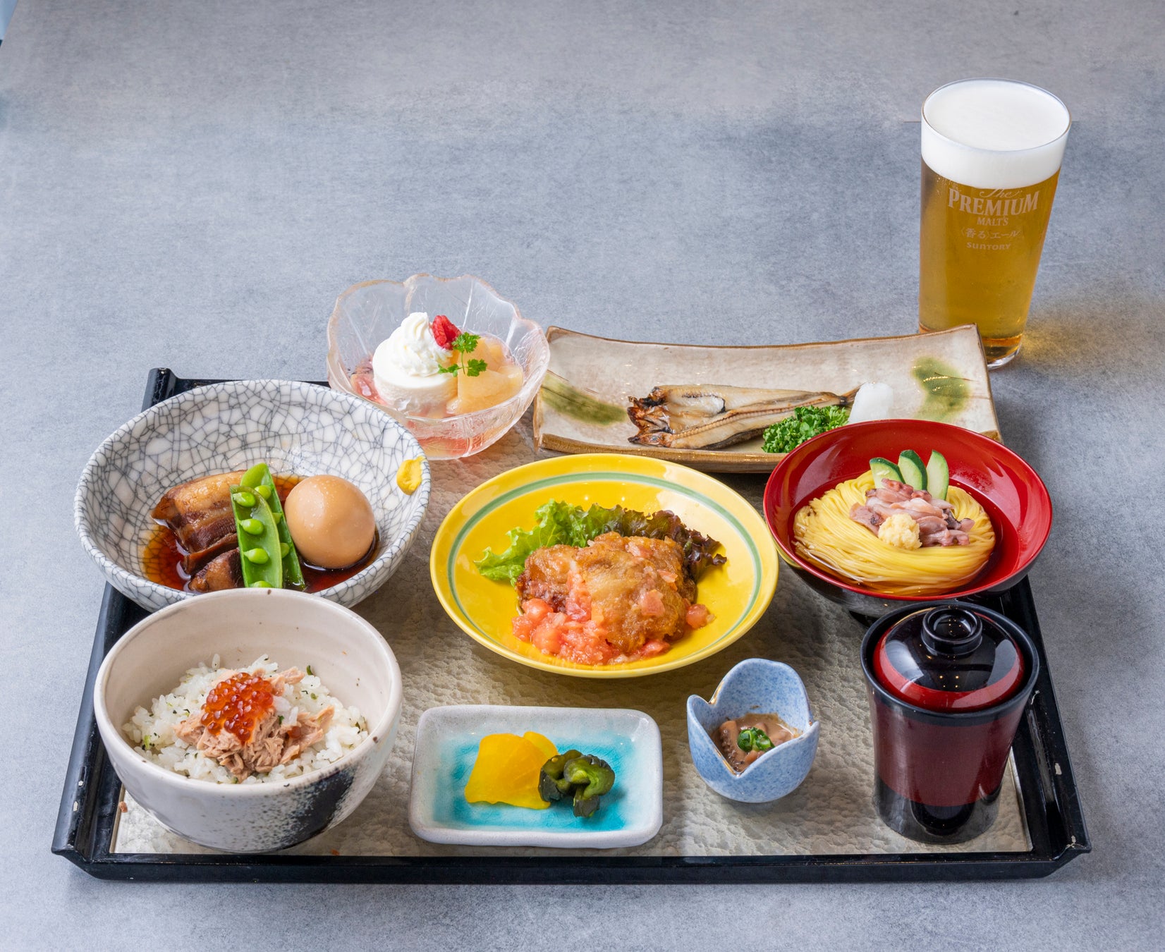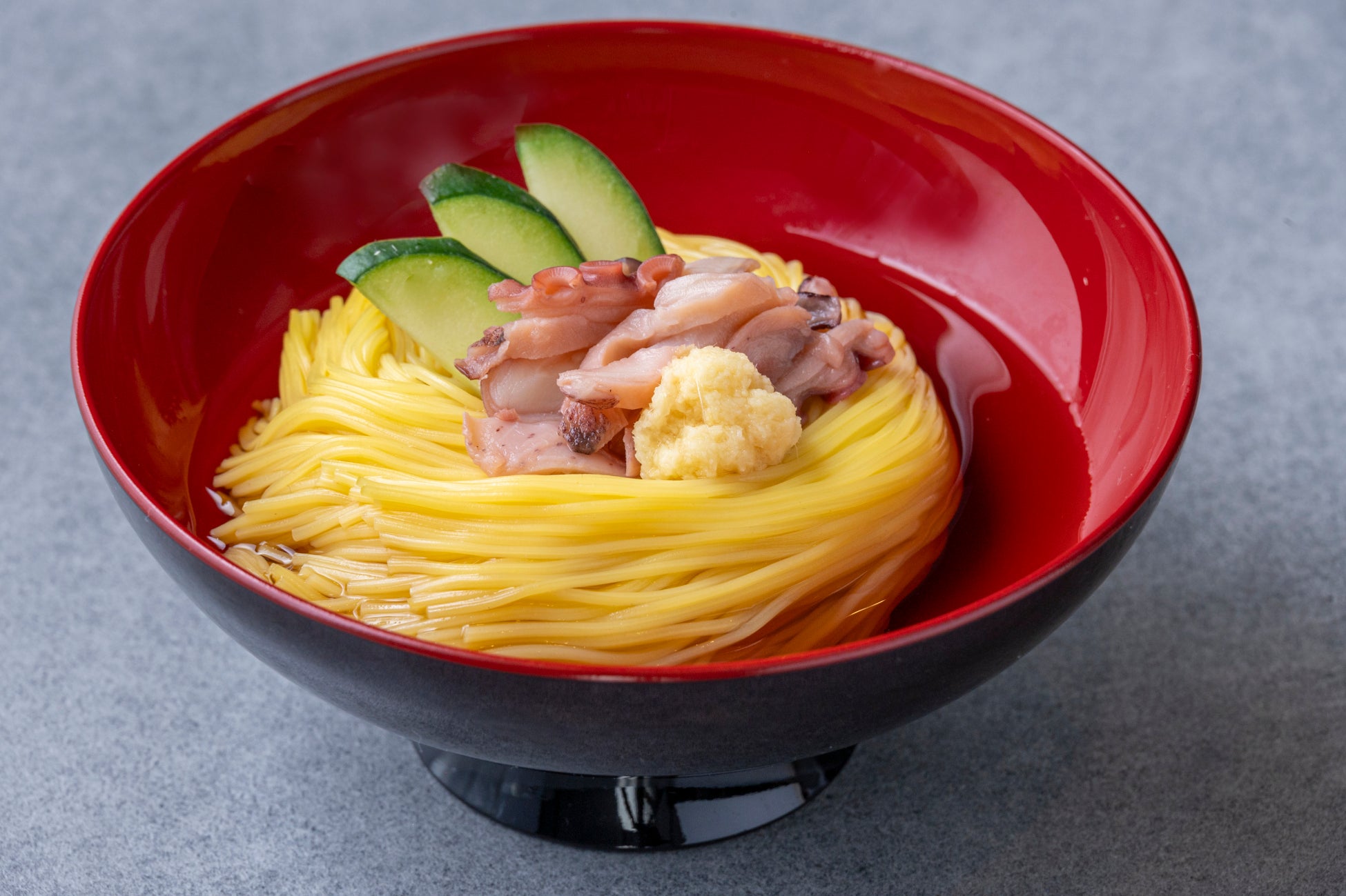 そして、夏を感じるメニューとして「福島県産タコと玉子そうめん」をご用意。目にも鮮やかな黄色い玉子そうめんはつるんとのど越しが良く、暑さに疲れた体を冷やしてくれます。添えられたタコのキュッキュとした食感との違いもお楽しみいただけます。