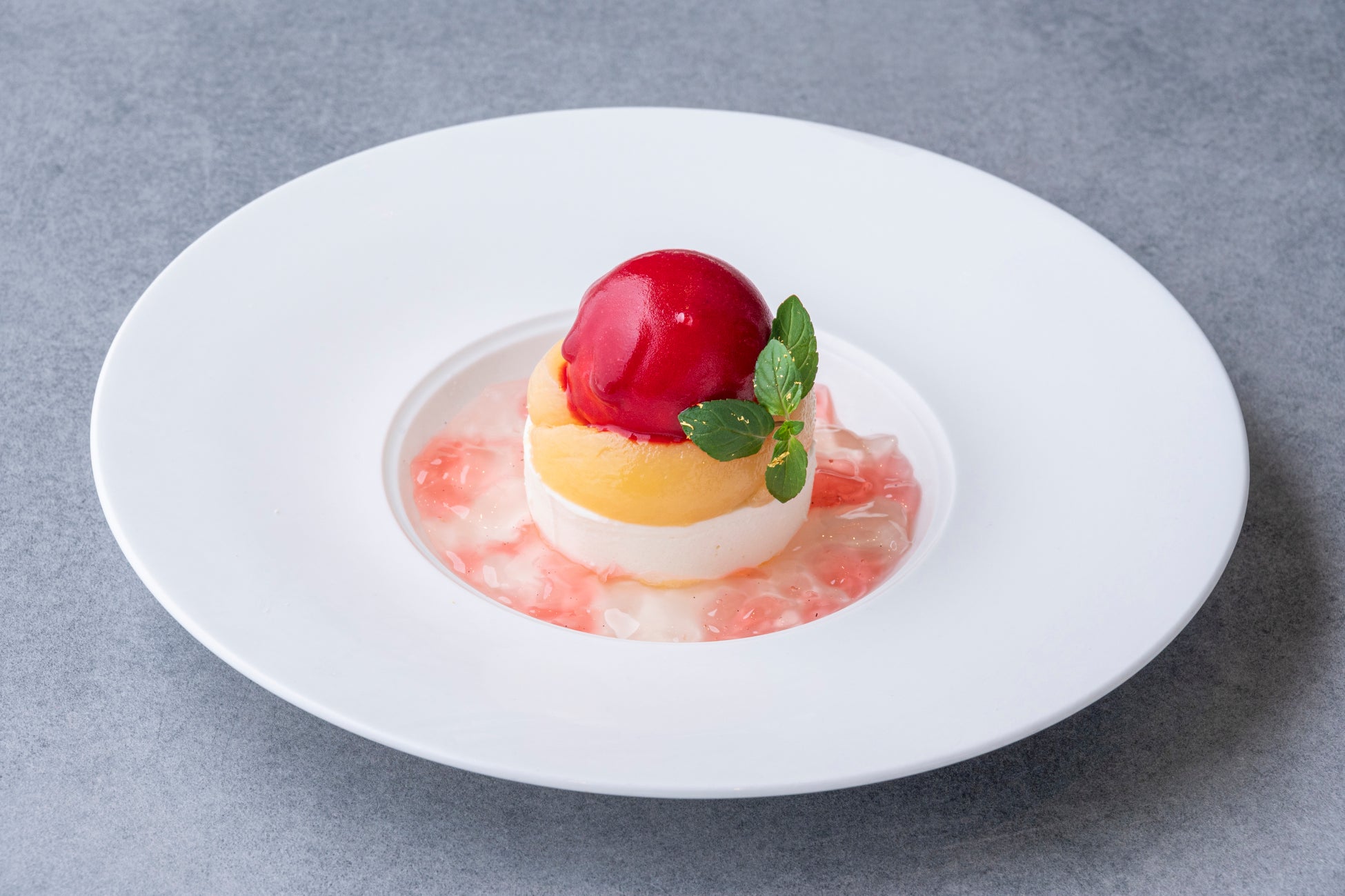 デザートメニューとして主にティータイムからディナータイムにお楽しみいただいている「アーモンドのムースと福島県産桃のコンポート」は、歯ごたえを残してコンポートに仕立てた桃に、フランボワーズのソースをかけたアイスが目を惹く、かわいらしい仕上がりに。10周年を記念して制作したロゴにも描かれた「ハナミズキ」のイメージを、白とピンクのワインジュレで表現しました。口中に広がる香りのハーモニーと、食感の妙をお楽しみください。