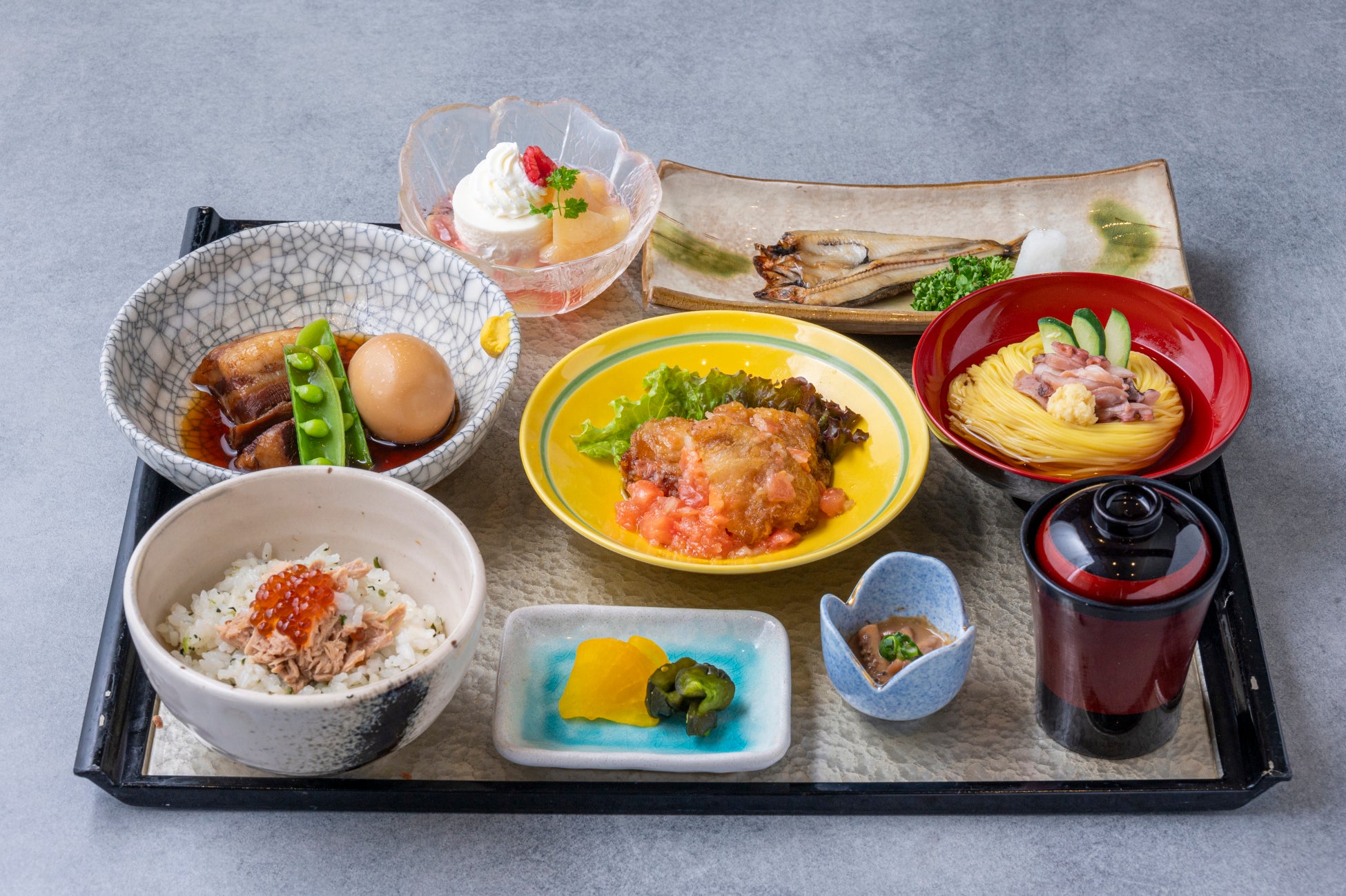 内容:福島県産麓山高原豚(はやまこうげんとん)の角煮/福島県産メヒカリの一夜干し/福島県産真イカのあん肝和え/福島県産アンコウの唐揚げ トマトヴェルジュソース/福島県産タコと玉子そうめん/福島県産カツオの菜飯/福島県産あおさの味噌汁/香の物/アーモンドのムースと福島県産桃のコンポート/コーヒーまたは紅茶