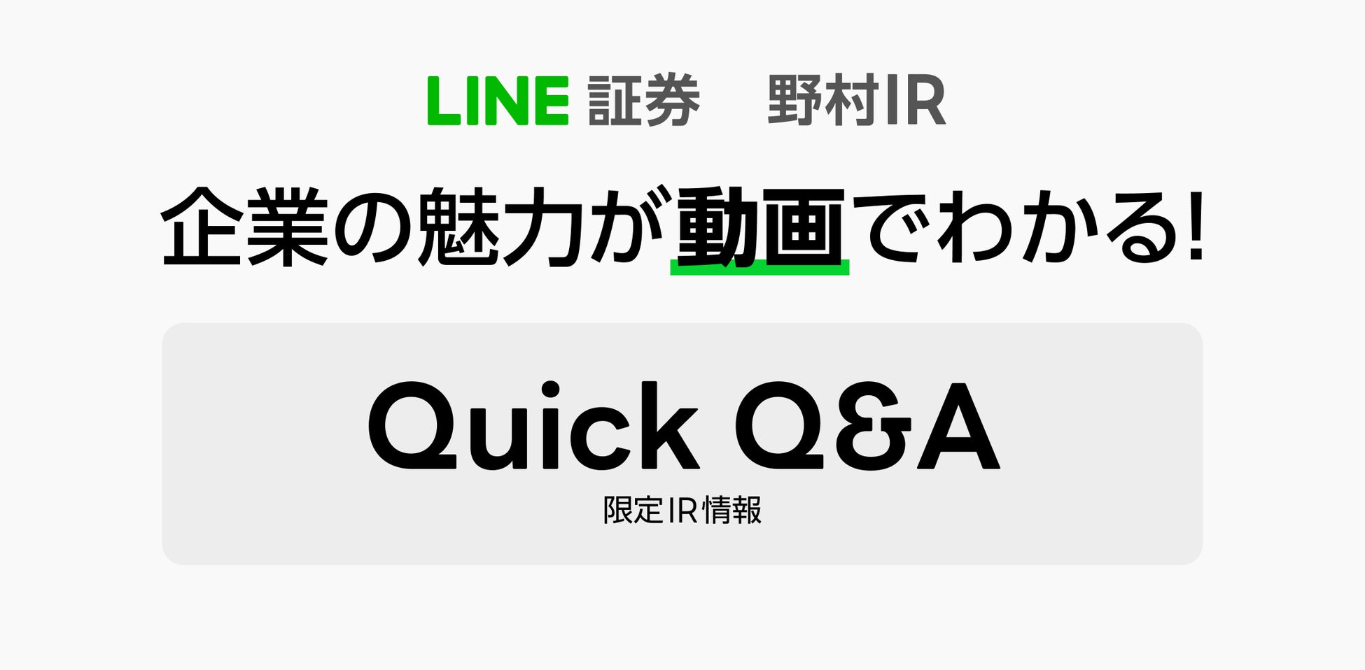 LINE証券株式会社(本社:東京都品川区、代表取締役Co-CEO:正木美雪・米永吉和)と野村インベスター・リレーションズ株式会社(本社:東京都千代田区、取締役社長:角田慎介 以下、野村IR)は共同で、スマホ特化型のIR動画サービス「Quick Q&A(クイック・キューアンドエー)」を立ち上げ、LINE証券のユーザーなど100万人以上に配信を開始しましたので、お知らせいたします。